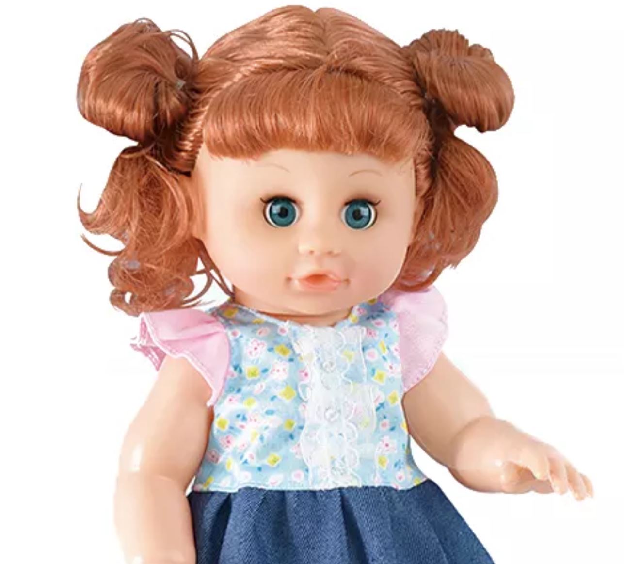 Лялька має рухомий > руки, ноги та голова, і коли ви кладете його, його очі закриваються. У лялькидовге каштанове/рудувате волосся та два хвостики.
