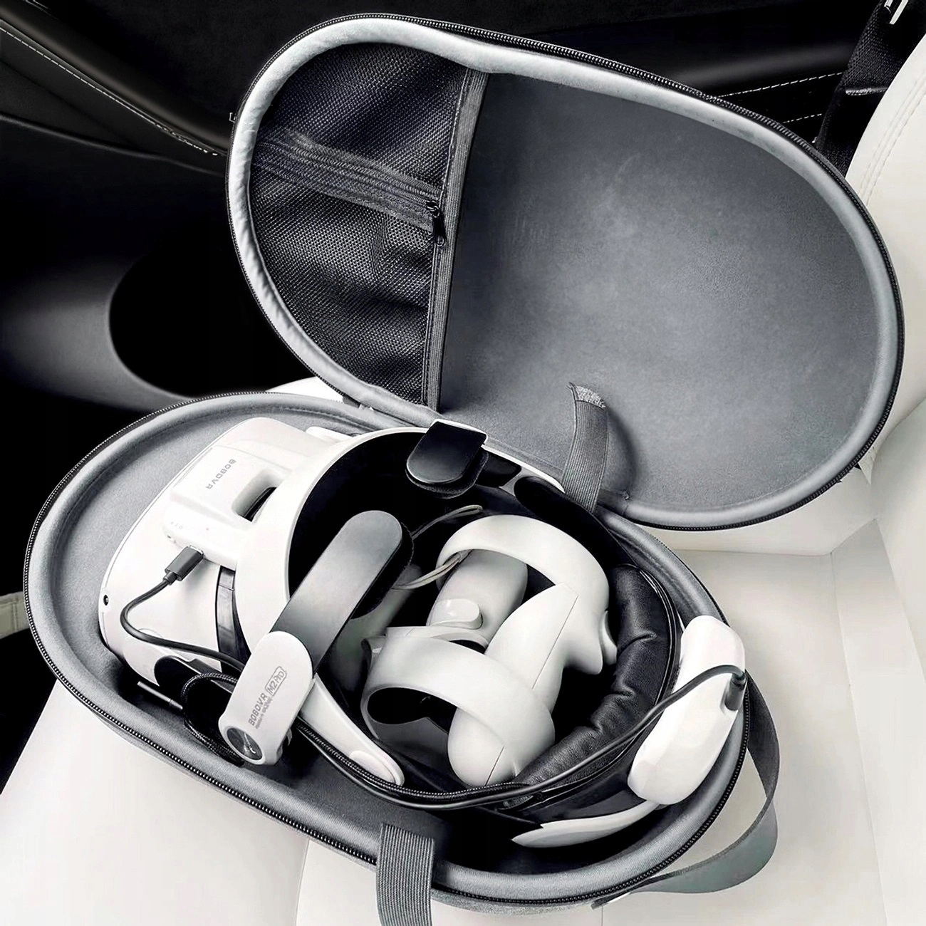 Корпус закінчений високоякісною тканиною завдяки тому, що вона виглядає елегантно та сучасно. Додатковою перевагою є інтегрована внутрішня кишеня для аксесуарів, таких як кабелі, смартфон або Powerbank. Всередині також є гнучкий, кріплений ремінь, так що після вставки окулу ви можете додатково захистити їх. Внутрішня губка має довговічну ідеально профілюється в квесті Oculus.