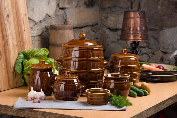 Зовнішня і внутрішня сторони посудини покриті глазур'ю, завдяки чому вона не реагує з кислотами, що робить її ідеальною для приготування заквасок і маринованих огірків.