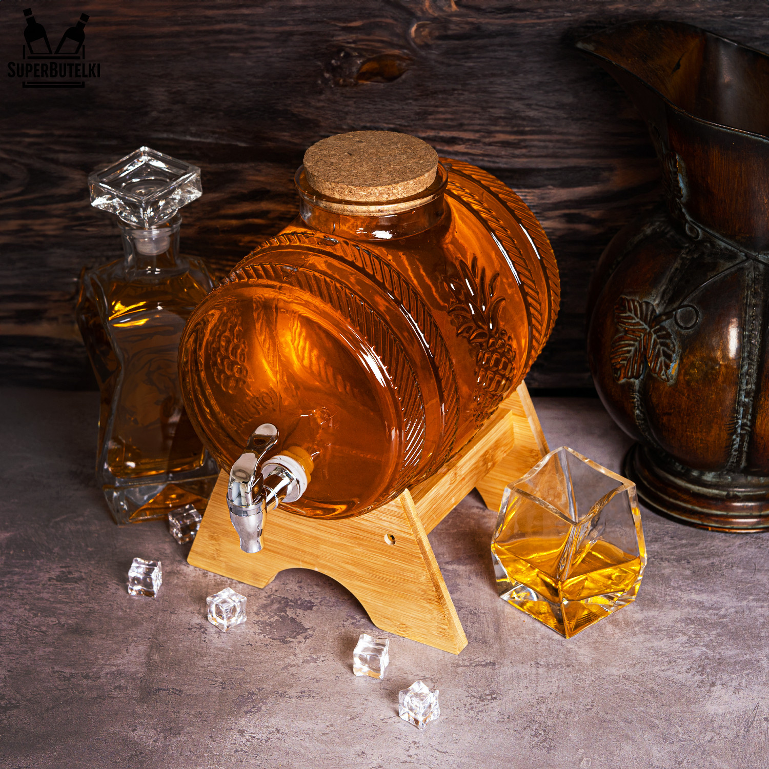 БОЧКА БОЧКА З КРАНОМ, ДЕРЕВ'ЯНОЮ ПІДСТАВКОЮ ТА ПРОБКОЮ ДЛЯ ЛИМОНАДУ, СОКУ, СПИРТУ 5 Л