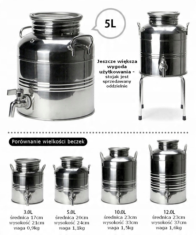 Високоякісна бочка виготовлена з міцної нержавіючої сталі та може вмістити 5 літрів рідини або сипучих харчових продуктів. Герметична бочка підійде як ємність для тривалого зберігання свіжого рослинного масла, вина, сиропу, соку, спирту, води або макаронних виробів, крупи, рису, квасолі, борошна, цукру або, наприклад, сухого корму для тварин. Крім того, бочка також є чудовим рішенням, коли ви хочете подати різноманітні напої в ресторані чи на природі.