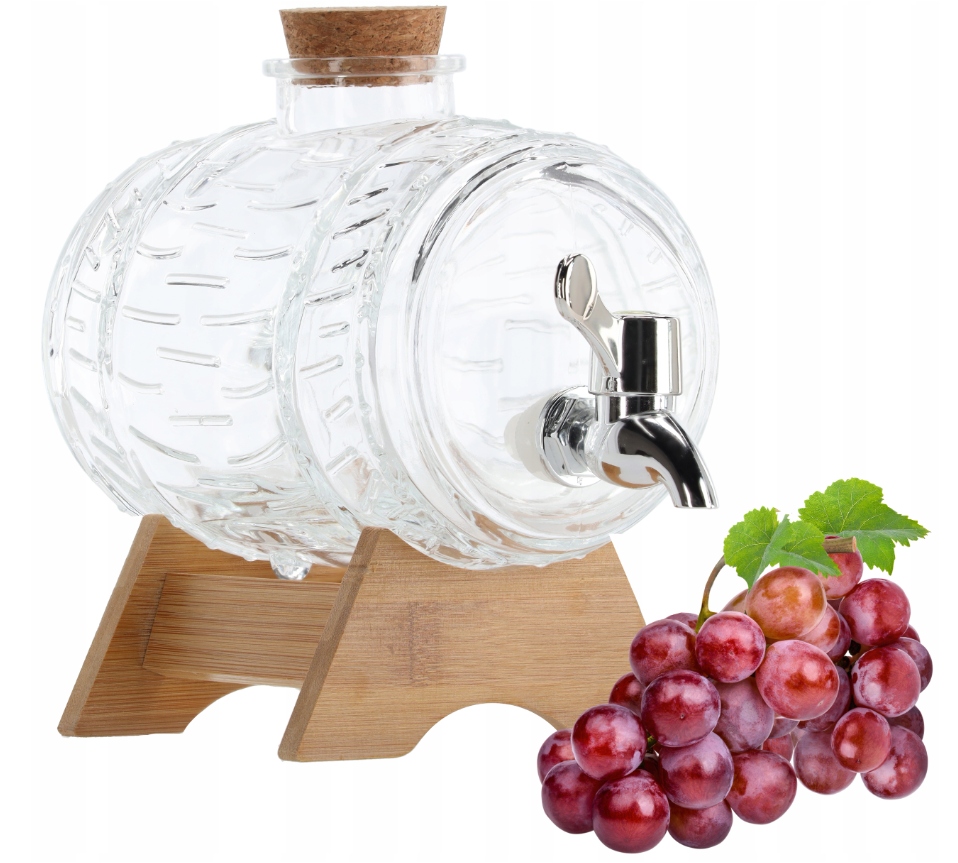 Бочка скляна з краном, на дерев'яній підставці. Завдяки цьому вечірка або зустріч з друзями запам'ятається надовго! Зручний у використанні, елегантний і практичний. Для вина, пива, віскі, соків і лимонаду. Завдяки підставці він дуже стійкий і виготовлений з товстого скла. Глек має зручний кран, який полегшує дозування рідини.