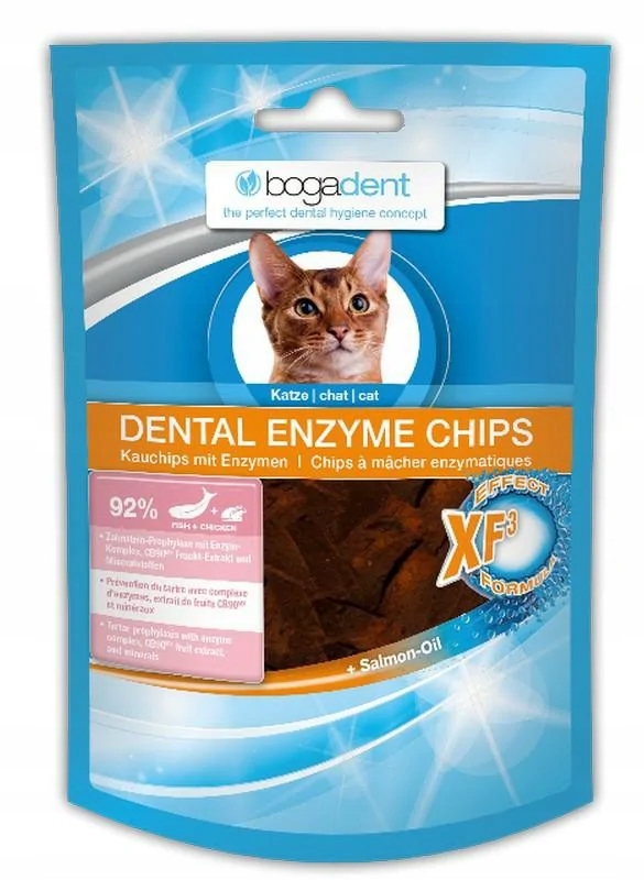 bogadent® DENTAL ENZYME CHIPS FISH – це смачні зубні чіпси, виготовлені на 92% з риби і курка. Функціонально доповнені інноваційною формулою XF3-Efekt, виготовленою з натуральних ферментів з концентрованої сироватки та двох додаткових активних інгредієнтів (екстракт фруктів CB90MX, мінерали), чіпси поєднують щоденний догляд за зубами з винагородою. Особлива консистенція смачних DENTAL ENZYME CHIPS також очищає зуби під час жування.