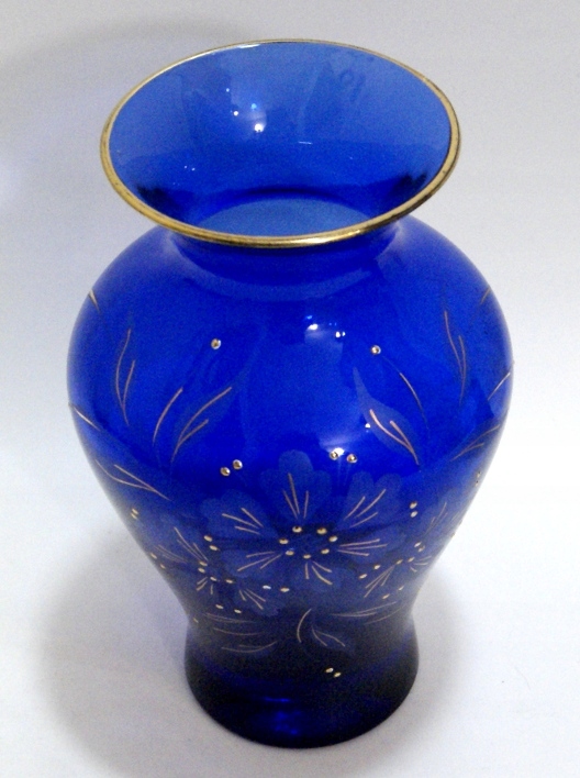 Красива старовинна ваза з кобальтового кришталю, ваза гарно прикрашена квітами з вплетеною позолотою, опуклими крапками. Ваза з товстим дном, стійка,