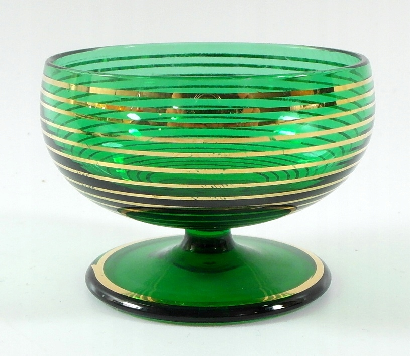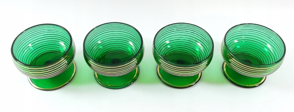 Гарний, старовинний набір з 4 чарок для лікеру та настоянки, із кришталю зеленого кольору, декор позолочений, гарні склянки, бочки.