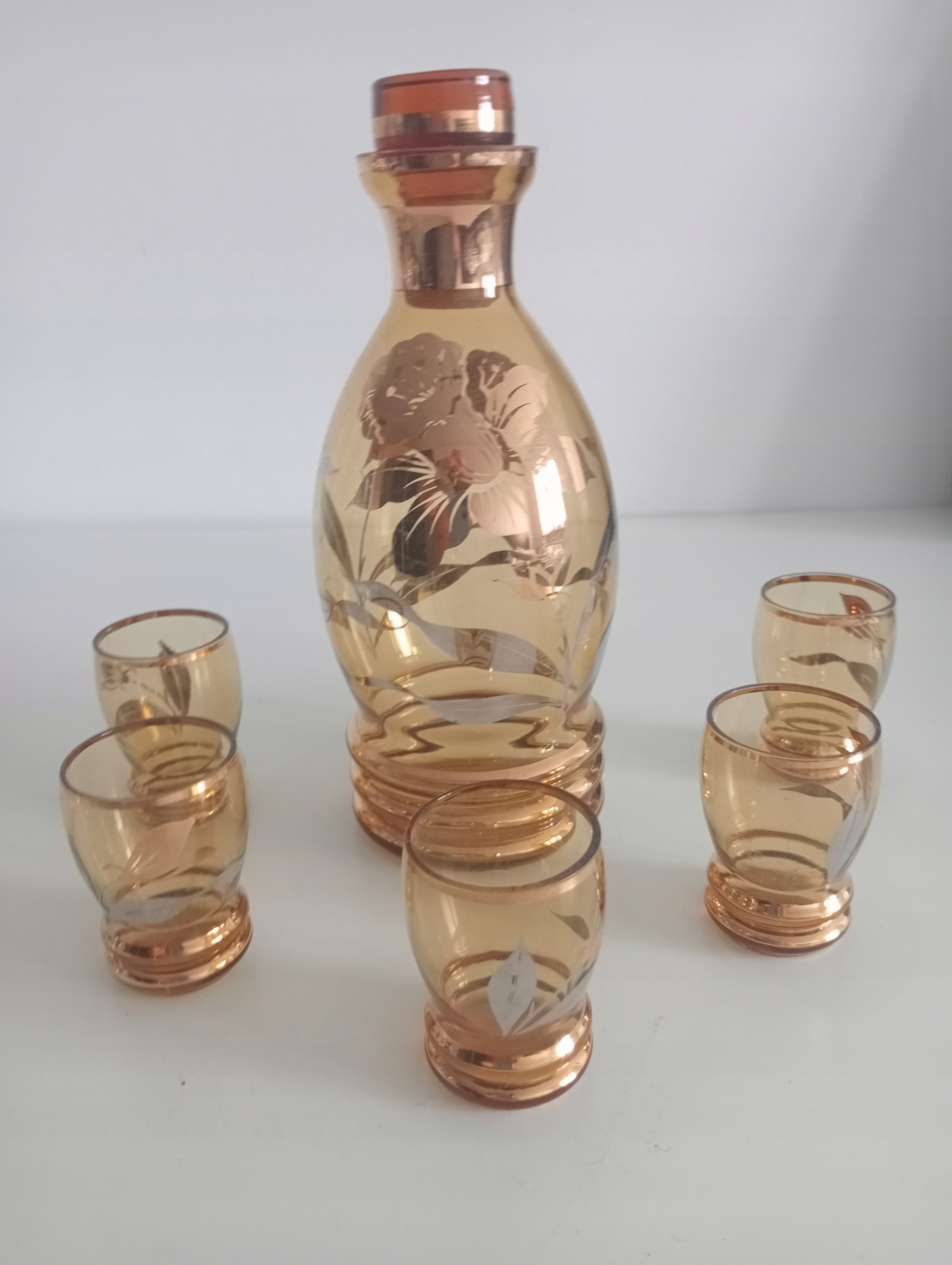 Унікальний набір графин і 5 склянок з бурштинового скла, прикрашеного золотим рослинним візерунком і золотими смугами на графині і склянках, пробка прикрашена золотою смугою. Стакан виготовлений в Чехії в 1960-х роках.