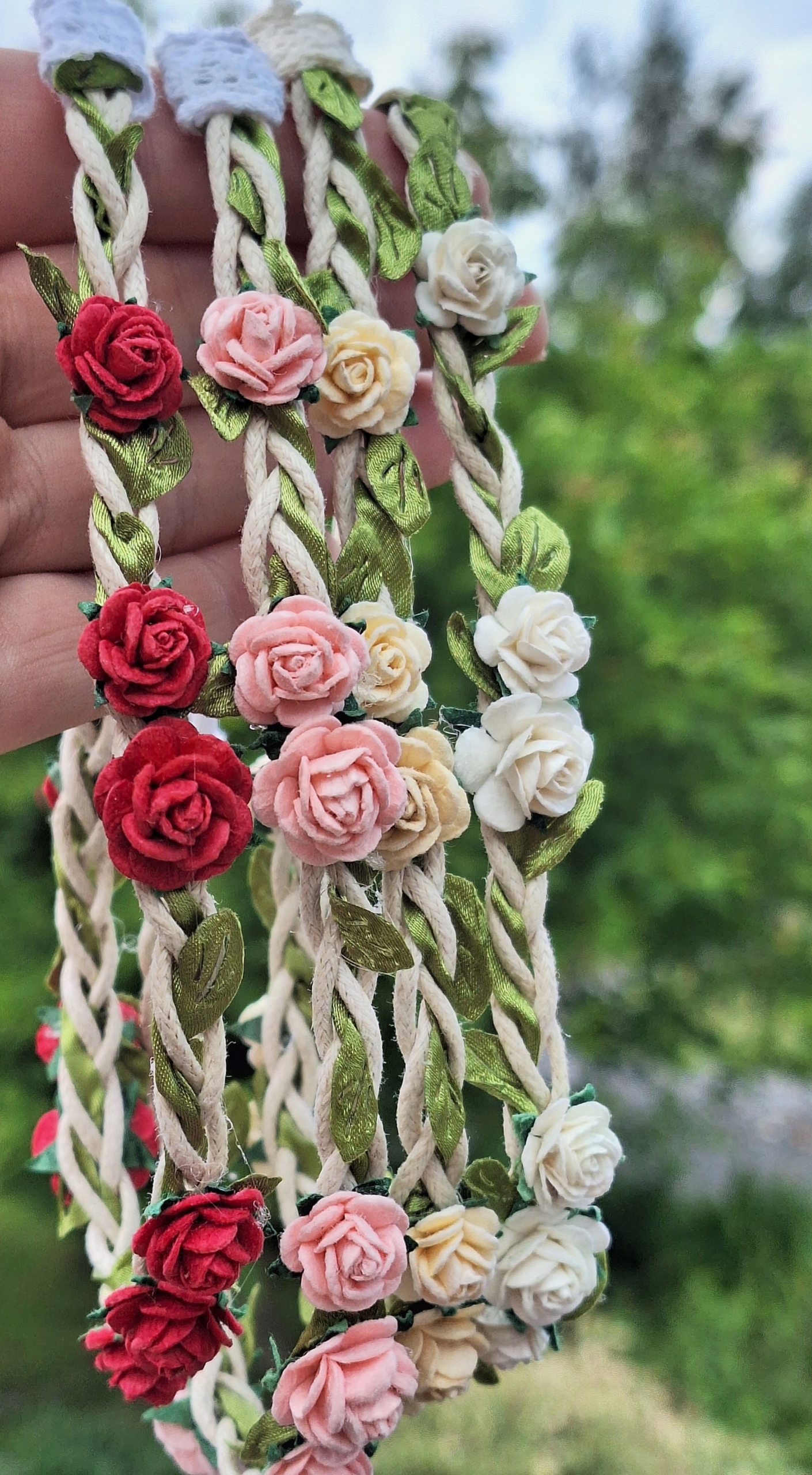 вінок для волосся, виготовлений з ремінця з листям і маленькими трояндами. На спині є марна гумка.