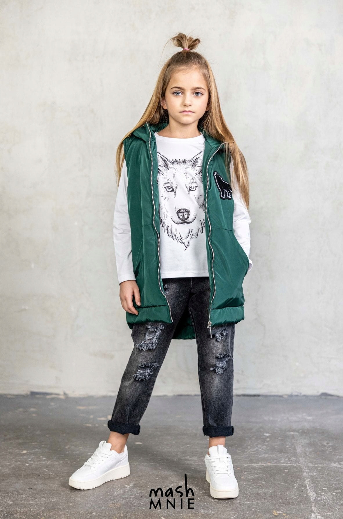 - Біла блузка з вовком та зелена жилетка в стилі є в інших пропозиціях, доки їх немає.