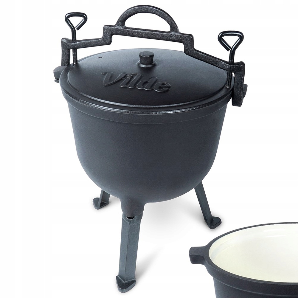 Каструля чавунна кругла на ніжках з кришкою і підвісною ручкою, з емальованим центром. Ідеально підходить для варіння, запікання, тушкування і смаження їжі на багатті, грилі або відкритому вогні. Страви, приготовані в казані, будуть соковитими і ароматними. Корисно під час різноманітних зустрічей, урочистостей та заходів, організованих на відкритому повітрі. Оригінальний продукт Vilde від Cast Line. Вироблено відповідно до європейських стандартів.