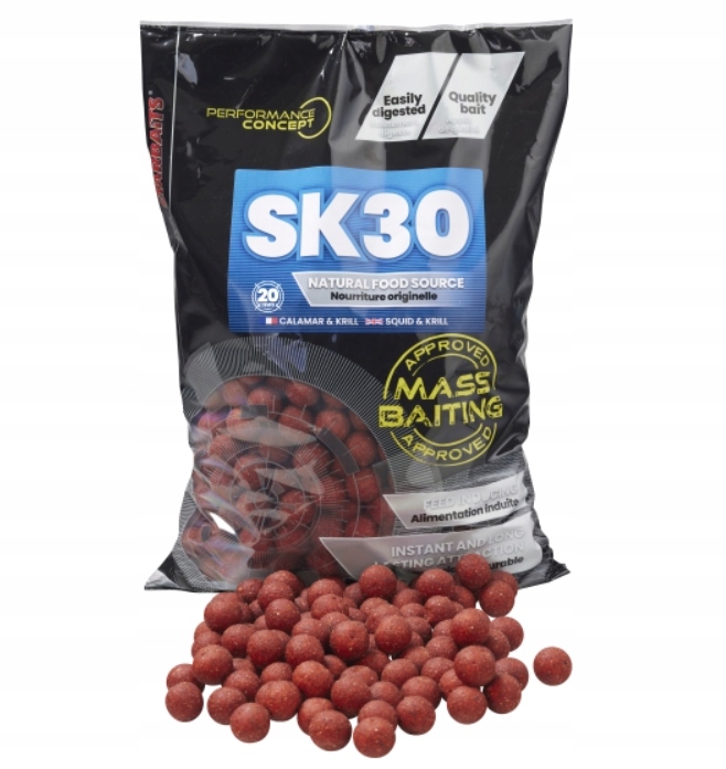 Це було створено з використанням високоякісного, термостійкого рибна патока і розчинні білки кальмари і криль. Завдяки своїй м'якості та однотонності, він має високий рівень поглинання та вивільнення інгредієнтів, що робить його привабливим для коропа. SK 30 відрізняється збалансованим рівнем натуральних масел, які сприяють швидкому залученню риби і збільшенню ваги приманки.