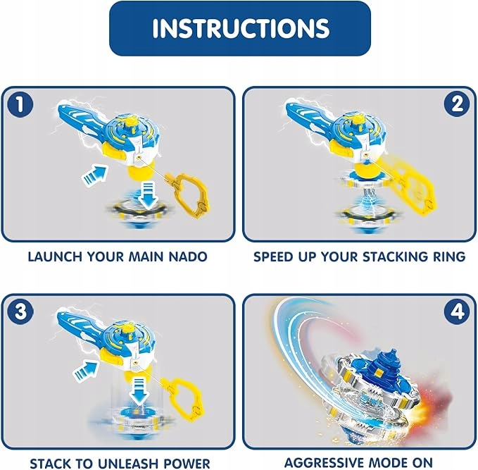 Сучасні дзиги Infinity Nado створені для максимальної потужності та видовищних боїв. Завдяки прикріпленим пусковим установкам їх швидкість і потужність обертання набагато більші, що робить кожен бій непередбачуваним і захоплюючим. Покращені магнітні пускові установки мають практичне місце для зберігання кілець, що виключає хаос під час бою та дозволяє зосередитися на дуелі.