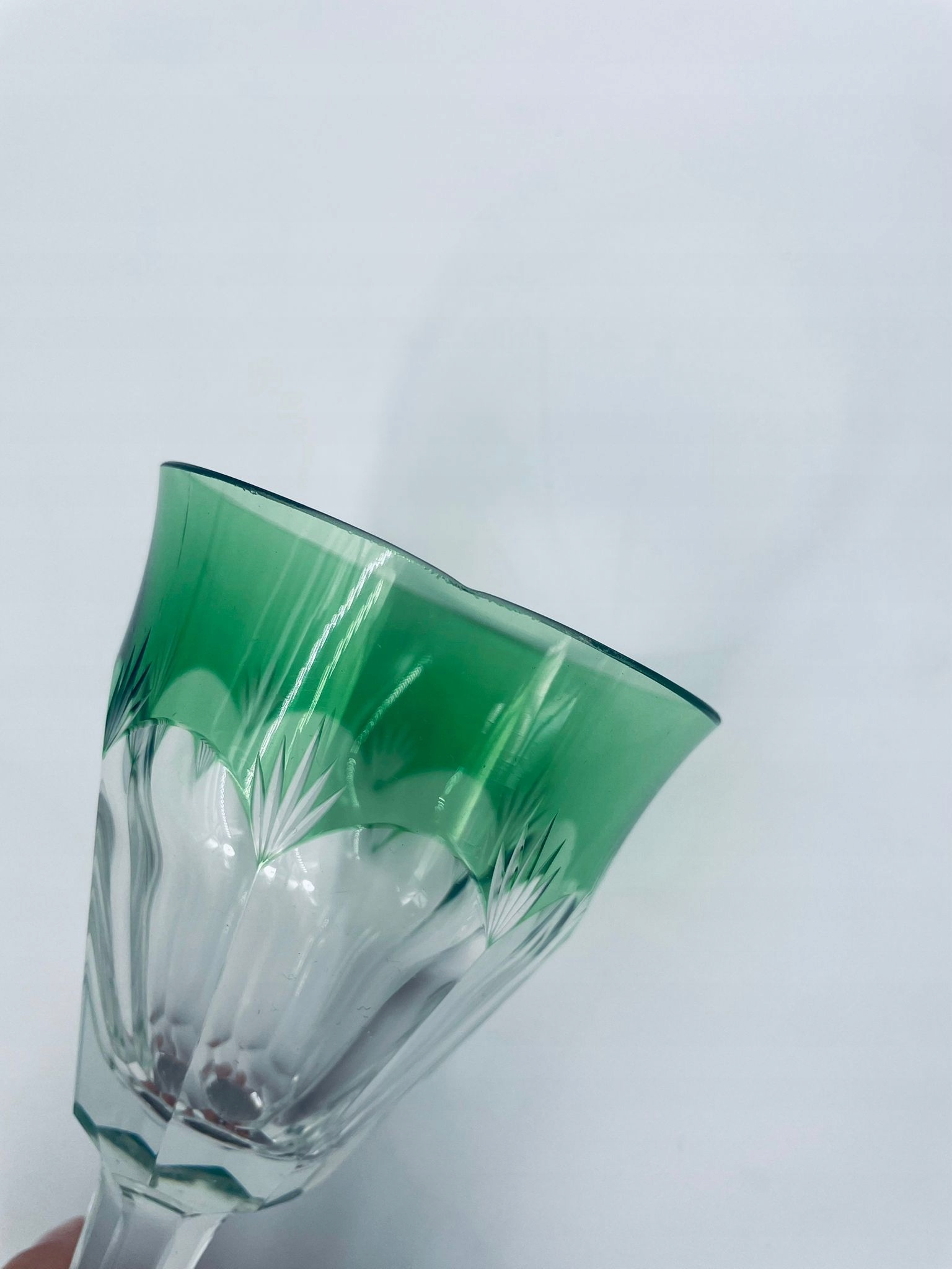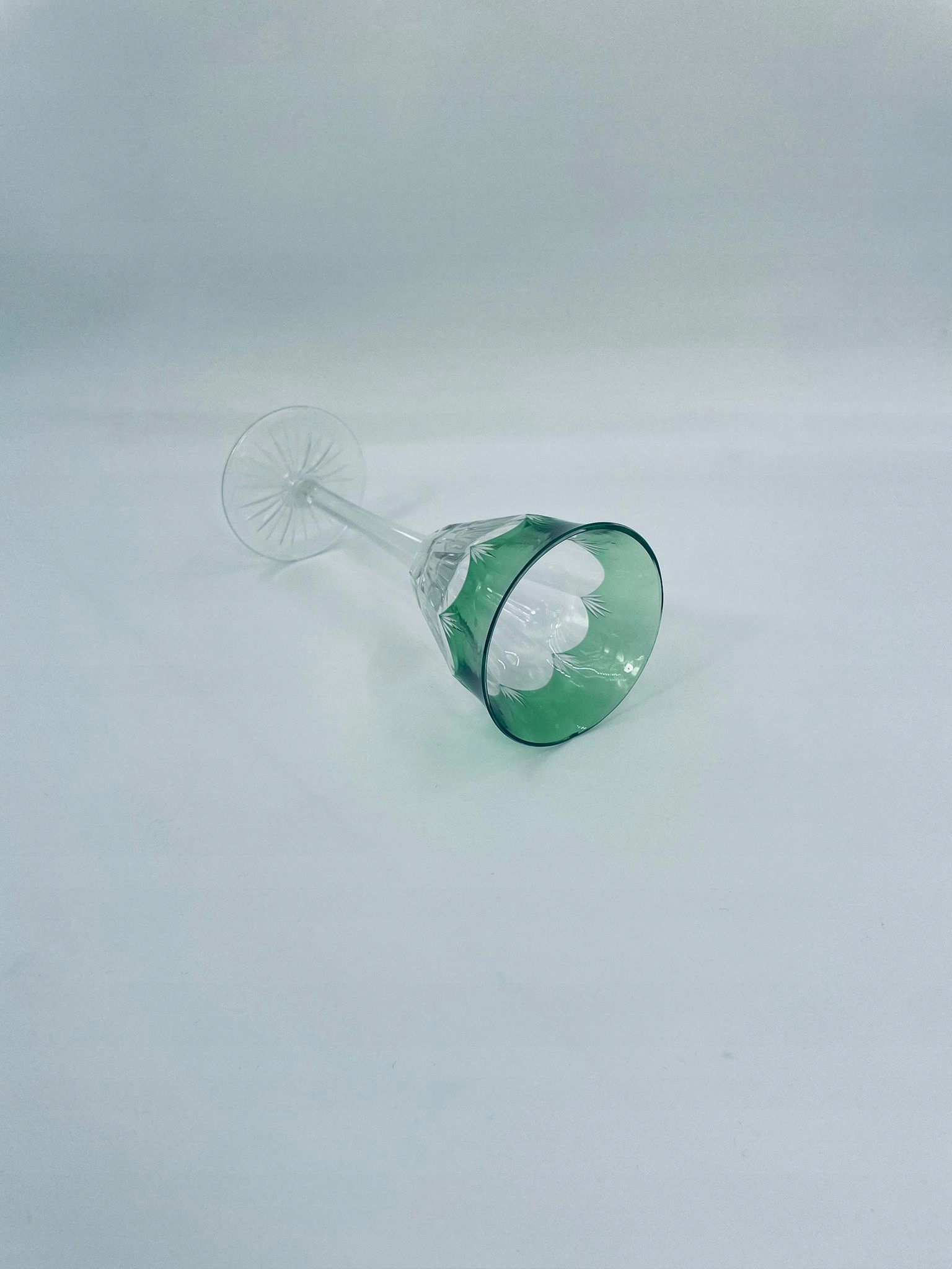Бекал для вина Baccarat Harcourt Roemer 1841, виготовлений з високоякісного кришталевого скла. Келих характеризується масивною формою, тонкою ніжкою, декоративною основою та декоративною зеленою чашею з плоскими ребрами. Скло має невелике пошкодження верхнього краю.