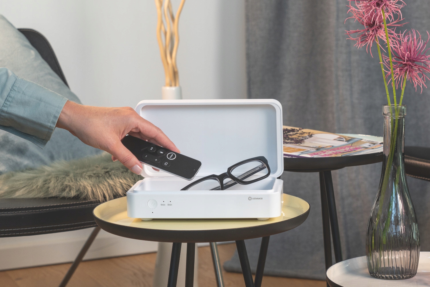 - У нижній частині коробки є опори, завдяки яким плоскі предмети, як-от мобільні телефони, дезінфікуються без необхідності реверсу