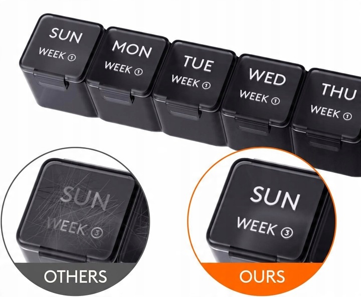 - Органайзер для ліків виготовлено з найякіснішого поліпропіленового матеріалу, дозволеного для контакту з їжею, що робить його міцним і не містить бісфенолу А. Темні кольори непрозорі, що полегшує зберігання ліків, зберігаючи внутрішню конфіденційність. Внутрішня поверхня коробки для таблеток гладка, легко чиститься і не залишає слідів, тому ваші таблетки не змішуються з попередніми залишками. Ваші таблетки завжди будуть безпечними для споживання.