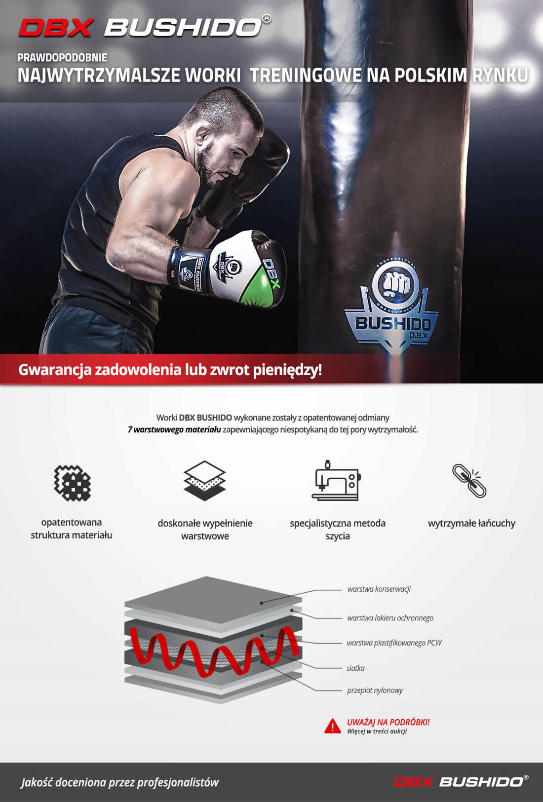 Пам’ятайте, що сумка піддається багатьом пошкодженням, тому необхідно використовувати матеріали найвищої якості. Ми не приймаємо компромісів у цьому питанні - найголовніше якість і довговічність матеріалу. Завдяки такому підходу до виробництва наші боксерські мішки отримали визнання не лише серед аматорів, але й серед багатьох титулованих гравців і тренерів як у Польщі, так і за кордоном.
