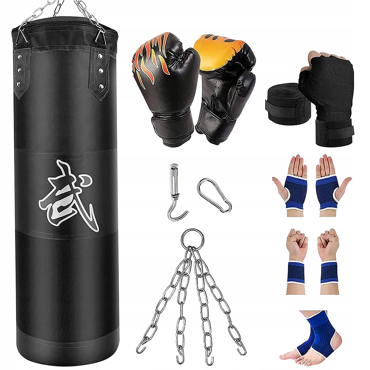 Для кращого захисту, боксу та ударів ногами до комплекту входять боксерські рукавички, бинти для рук, вішалка для сумки, 4-шаровий сталевий ланцюг, карабін, захист для зап’ястя, захист для рук і суглобів. Крім того, амортизуюча набивка з піни може витримати найсильніші удари вдома чи в спортзалі та запобігти травмам під час боксу та ударів ногами.