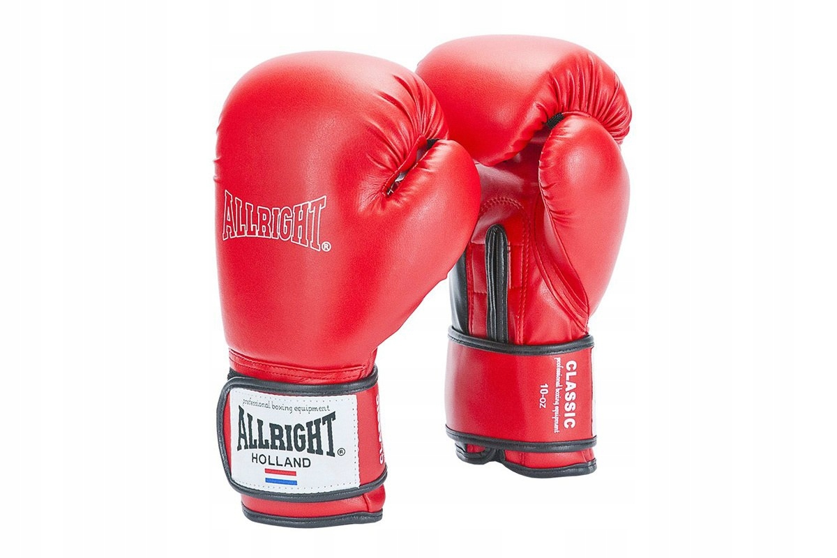Класичні, професійні боксерські рукавички Allright виготовлені з високоякісної синтетичної шкіри, яка характеризуєтьсявисокою міцністю. Внутрішня частина рукавичок наповнена піною EVA високої щільності, що робить рукавички безпечними та зручними під час тренувань та спарингів. Ідеально амортизує удари, захищаючи руки від травм, і при цьому дозволяючи стиснути кулаки. Завдяки широкому ремінцю із застібкою-липучкою ви зможете ідеально підігнати рукавички під свою руку і вони не будуть повертатися під час тренувань і не викликати роздратування, а також відмінно зміцнять зап'ястя, що істотно підвищить безпеку і захистить від травм. Наповнювач з піни EVA гарантує відведення вологи та повітрообмін, а також охолодження рук, що значно знижує ризик подразнення та потертості шкіри. У професійних рукавичках марки Allright великий палець захищений від вибивання міцним пришиванням до рукавички. Ці рукавички стануть в нагоді не тільки боксерам, а й професійним спортсменам інших видів єдиноборств, наприклад, кікбоксингу, муай тай, К1. Їх можна використовувати як для спарингів, так і для тренувань на обладнанні.