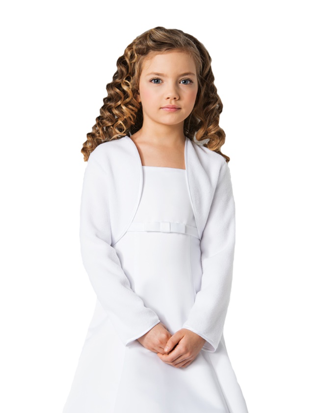 Пропонуємо вашій увазі нове болеро для причастя з довгими рукавами, без коміра-стійки. Вона дуже акуратно виготовлена з флісу та оброблена окантовкою. Доступний у білому або чорному кольорі.