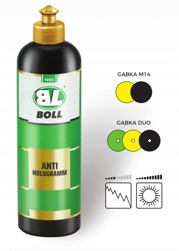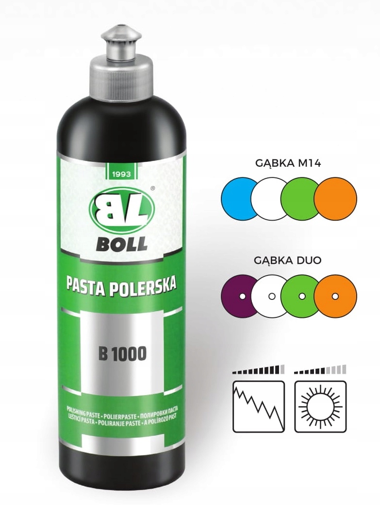 Це ніжно абразивна паста, яка усуває мікроподряпини та можливі голограми, утворені під час попередніх полірувальних робіт. . Після використання пасти BOLL B1000 і поєднання її з правильно підібраною губкою дозволяє досягти т.зв. "дзеркала".