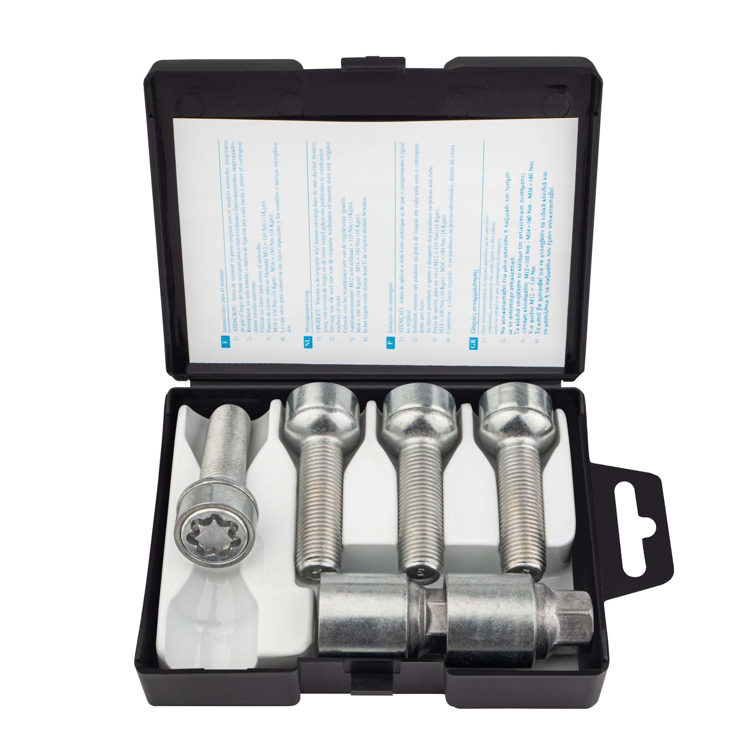 Набір складається з 4 болтів безпеки та 2 ключів з ексклюзивним дизайном канавок. Загартовану головку неможливо відкрутити без відповідного ключа. Термічно оброблений метал болтів стійкий до випробувань на зріз/розрив, а посилена додаткова шарнірна втулка і низьке розташування болта всередині обода виключають можливість крадіжки за допомогою підручних інструментів (ключ/розвідний ключ, плоскогубці та ін.) .