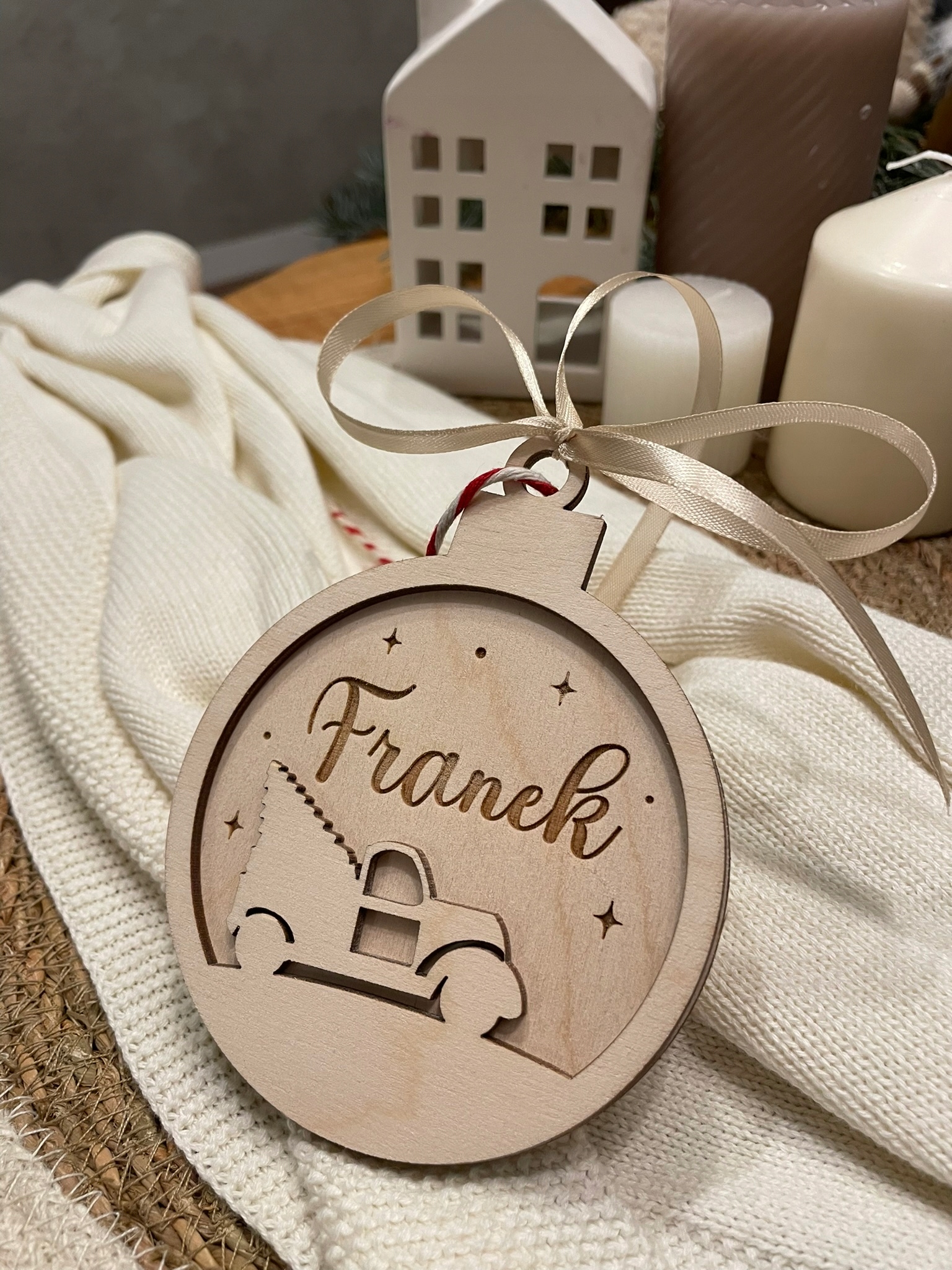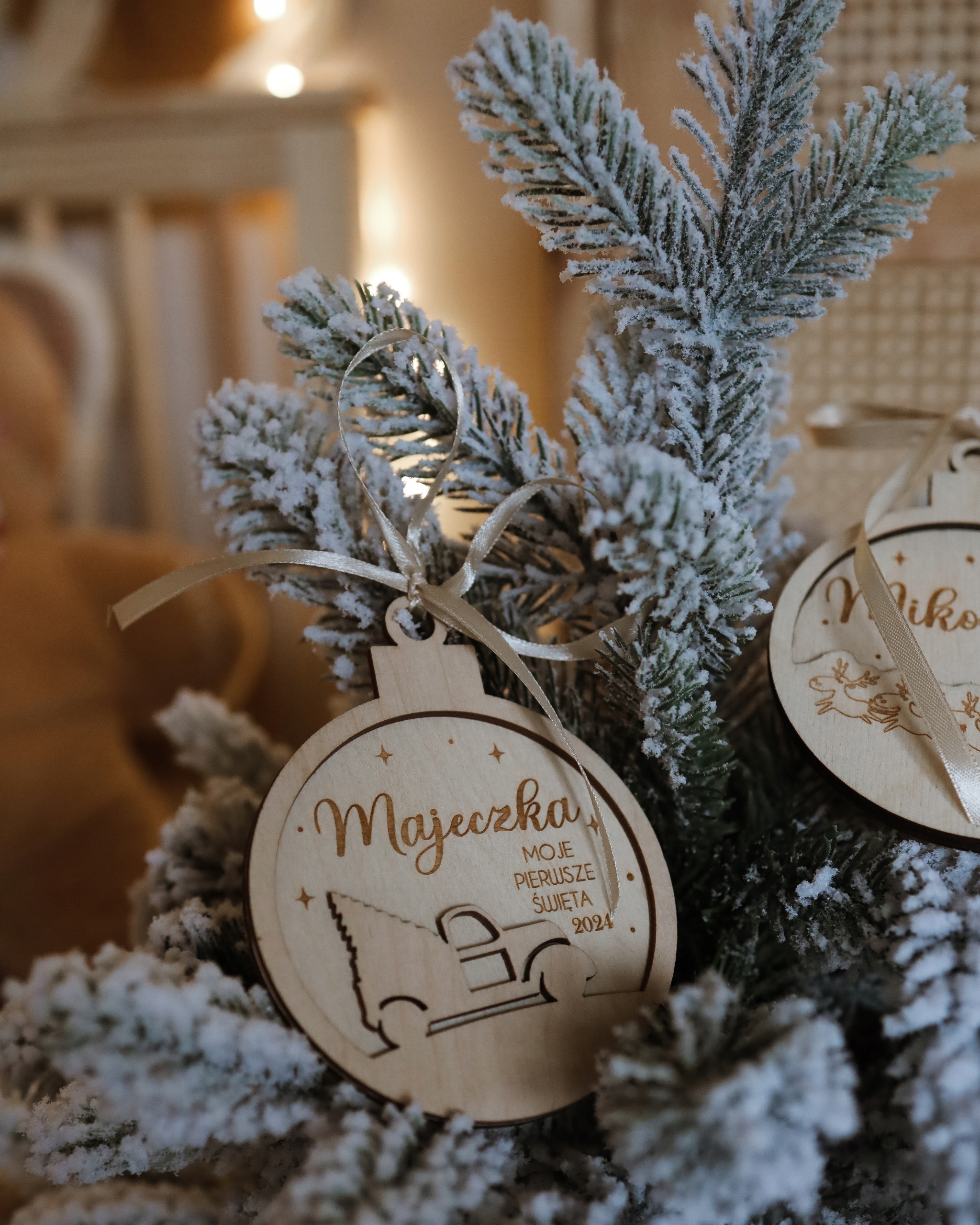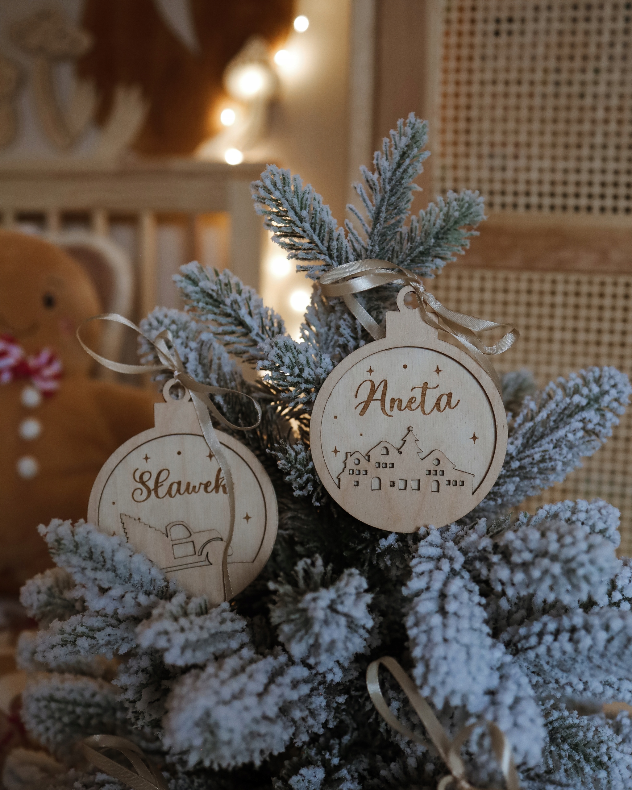 BOMBKA DREWNIANA 3D Z IMIENIEM NA PREZENT dowolny tekst +SZNUREK HIT Święta