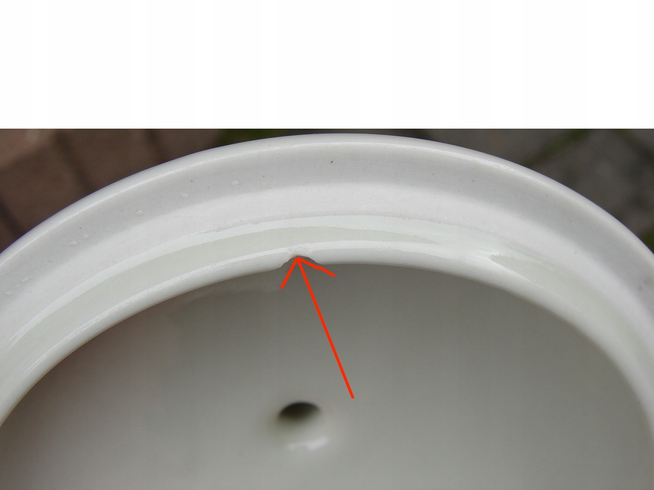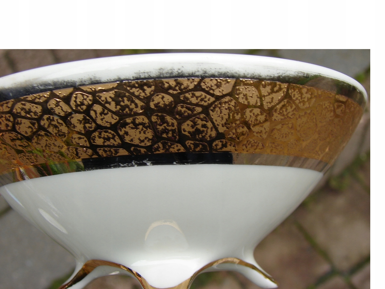 Позолота має потертості, кришка має скол у внутрішній частині, дефект показано червоною стрілкою.