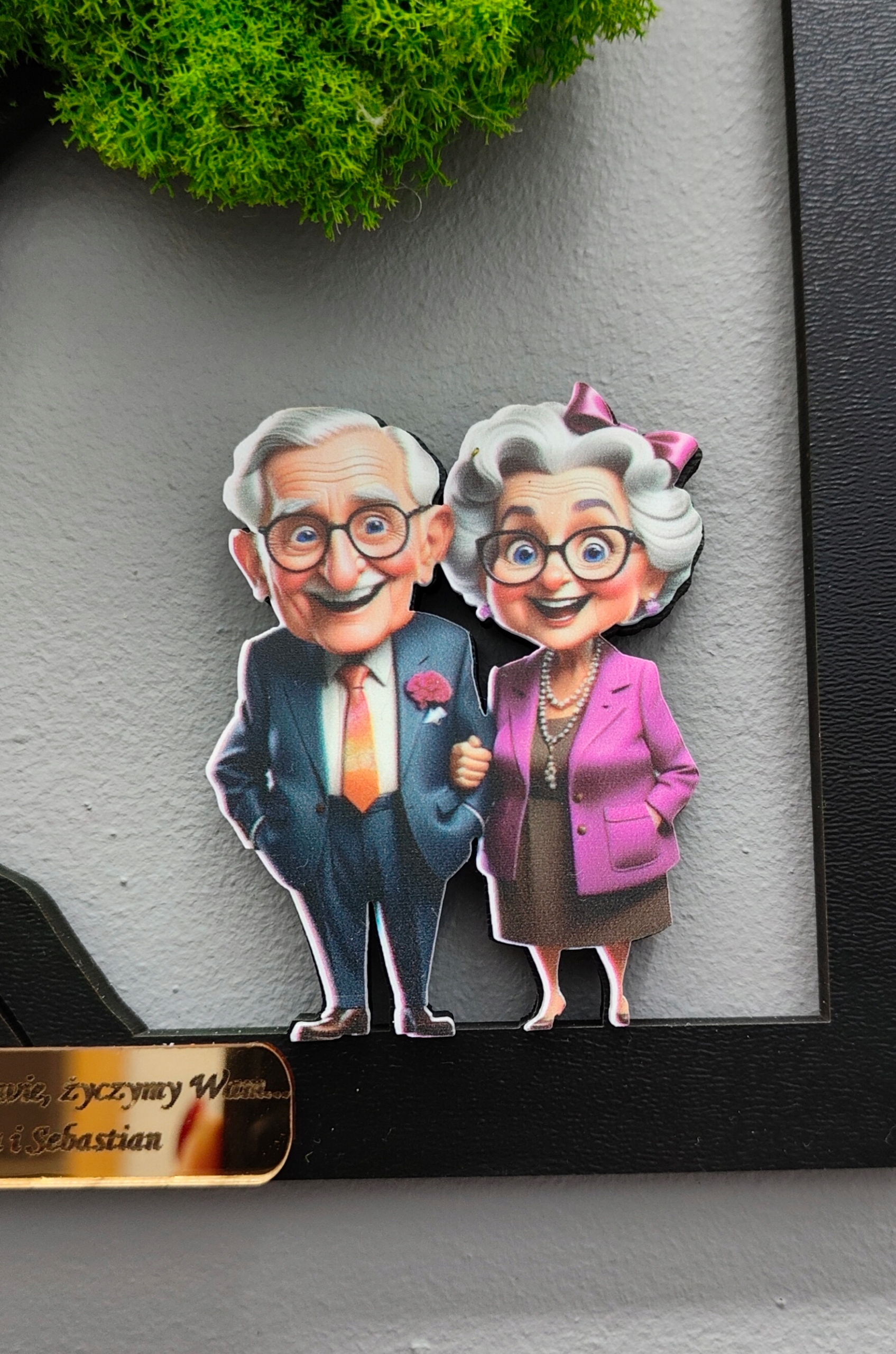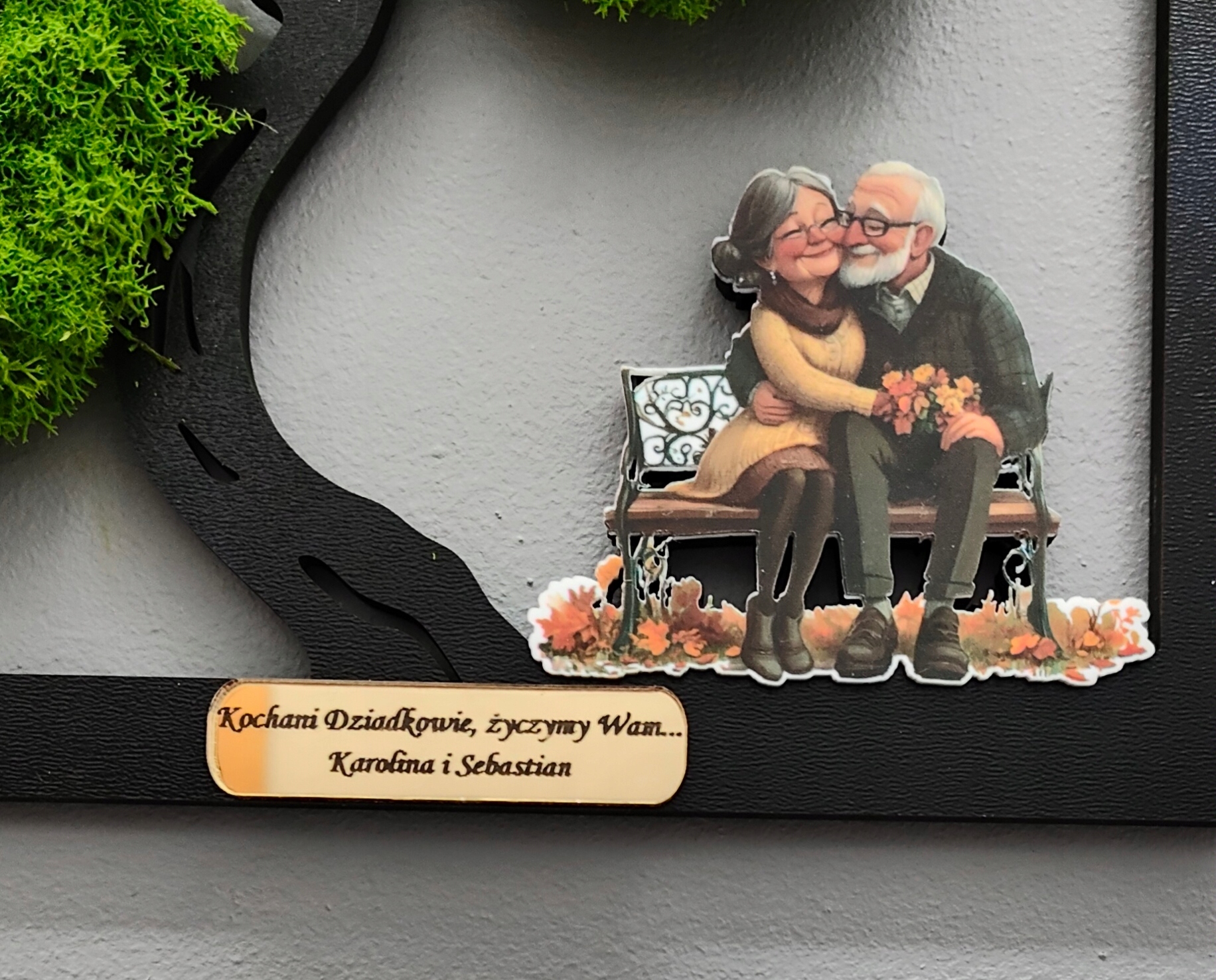 Бонсай - дерево щастя в подарунок до Дня бабусі та дідуся. Дерево, прикрашене мохом. Фігура дідуся/бабусі/дідуся включена в дерево. Додатково оправу прикрашає красива, незвичайна табличка із золотого/срібного дзеркала. Золоте/срібне дзеркало додає елегантності та шарму. Гравірування на пластині можна вільно змінювати.