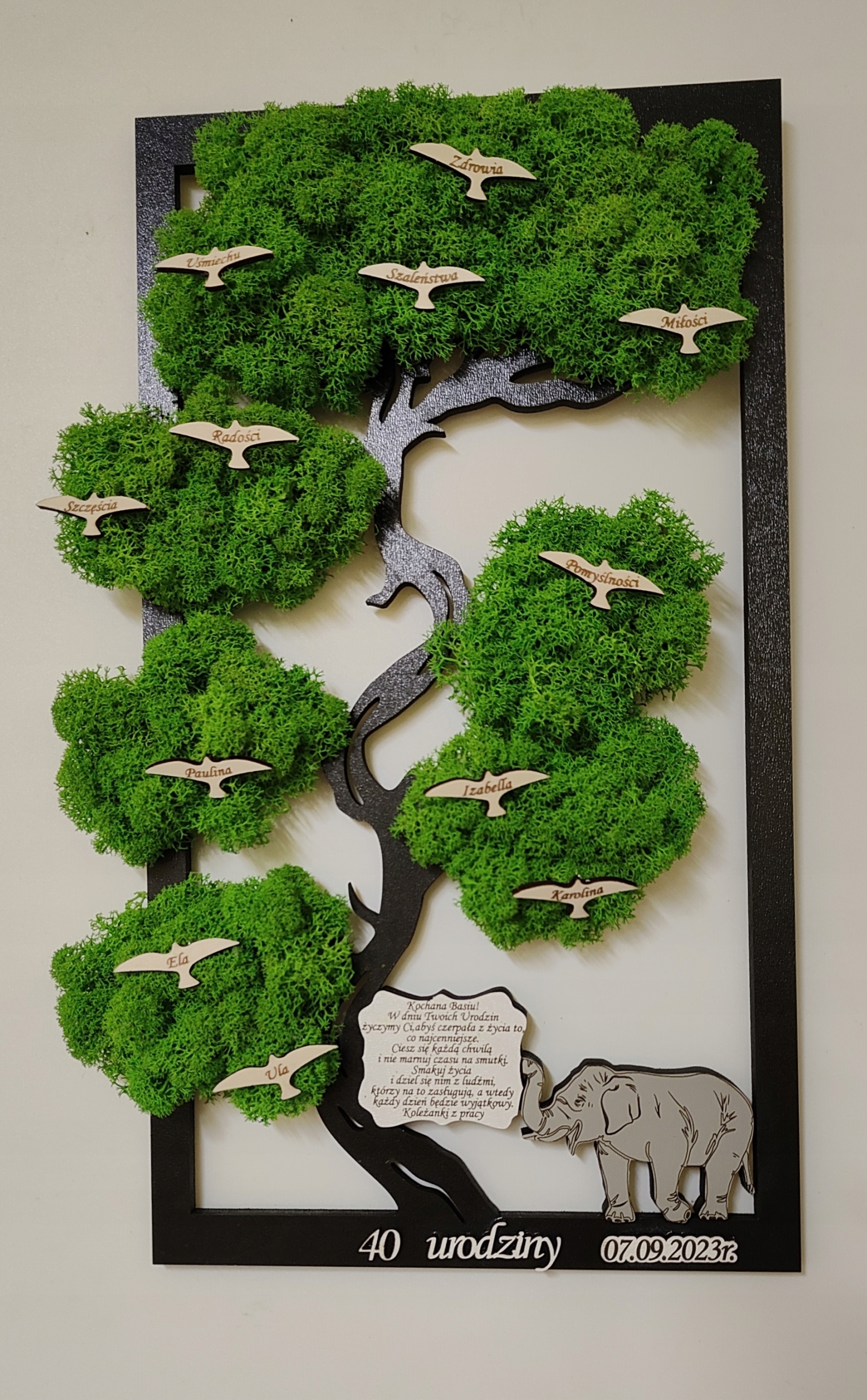 бонсай - дерево щастя як подарунок для різних випадків - дні народження, дні імен, ювілей тощо. Дерево, прикрашене мохом. Рамка зображення сірий, гравірований слон, що тримає трубу з будь -якою відданістю/побажаннями. Гравірування можна вільно змінювати. Гравірування навіть з великою кількістю тексту надзвичайно чітка. Ми можемо вільно змінити тексти у птахів. Птахи включені - малюнок до 30 шт. Ми можемо видалити ці написи - все залежить від індивідуальних потреб покупця. Ви вирішуєте, як буде виглядати ваше зображення. знаходиться в повністю технічному обслуговуванні. Вам не потрібно його вирізати або посипати. Для життя йому потрібна лише волога з повітря, яку він бере сам. Може залишатися свіжим до 11 років.