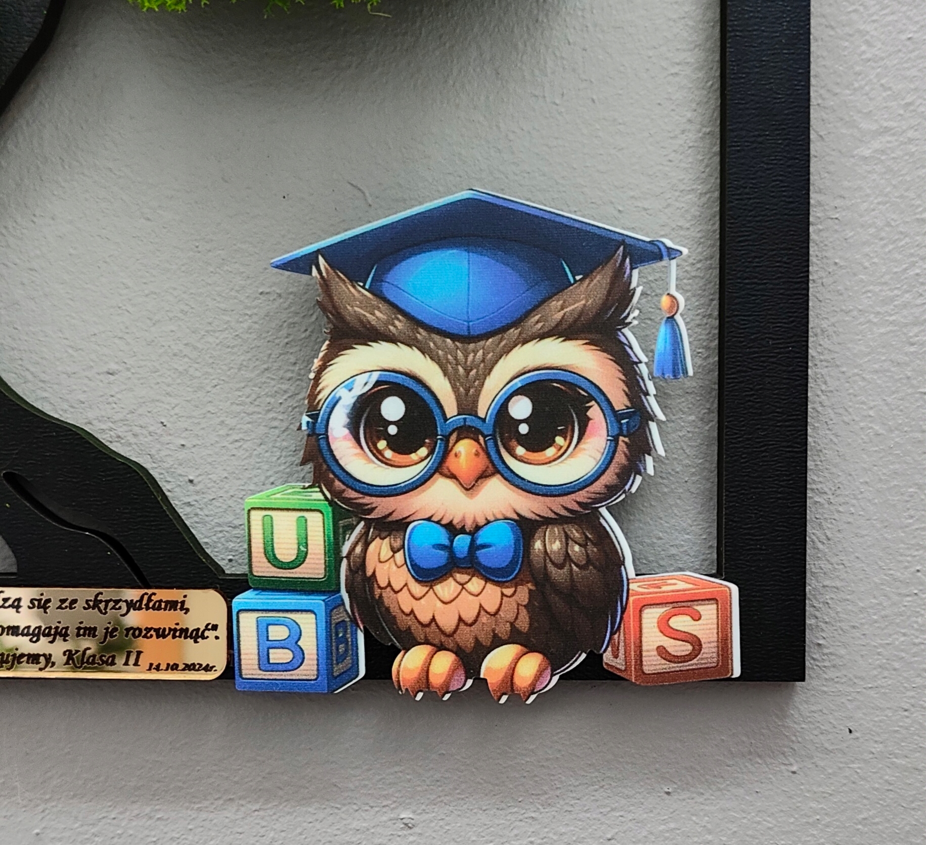 Правильний, зразковий опис - 3А; «Діти народжуються з крилами, вчителі допомагають їм їх розвивати». Дякую, 3А клас; золота табличка; сова S2; список дітей - Ханя, Кася, Йола та ін.