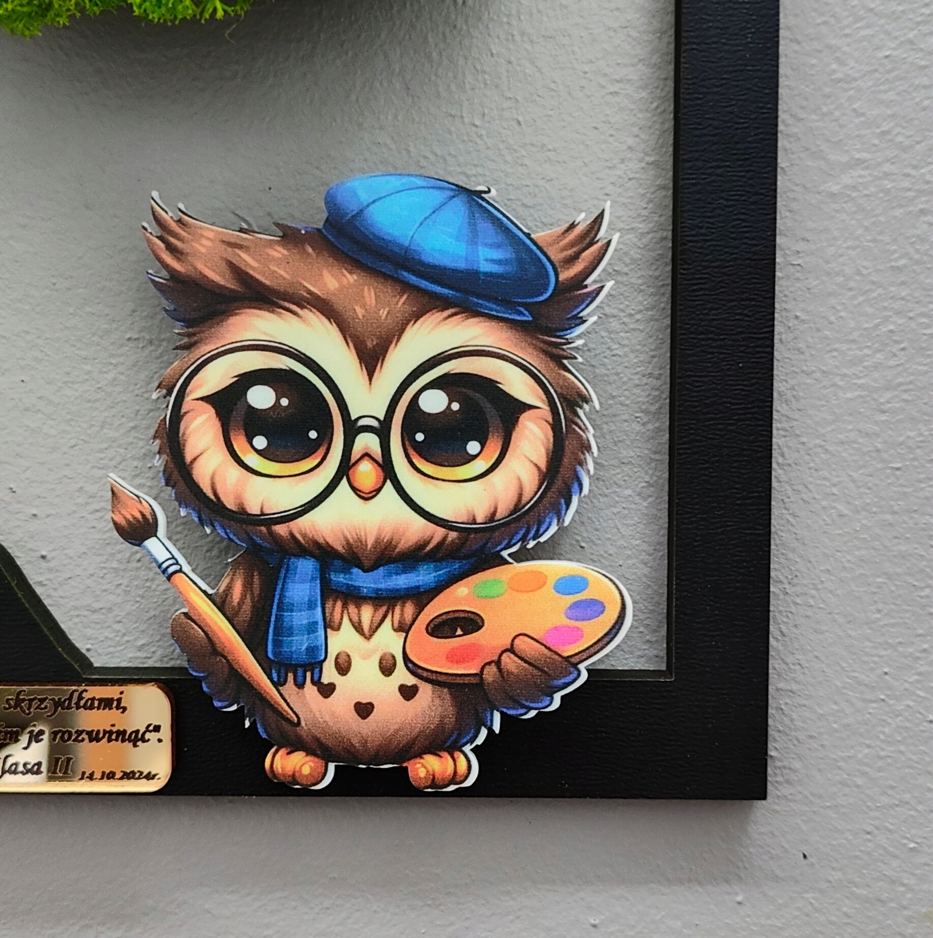 Бонсай з мохом з різнокольоровою совою + іменовані пташки