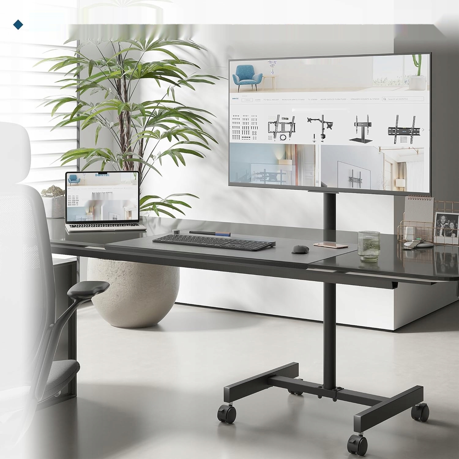 Стійка BONTEC, виготовлена з легованої сталі, підходить для пристроїв вагою до 20 кг. Це функціональне і елегантне рішення для тих, хто цінує мобільність і ергономічність роботи з екраном. Максимальний кут нахилу становить 30 градусів, а його мобільність і вишуканий дизайн роблять його практичним і естетичним продуктом.