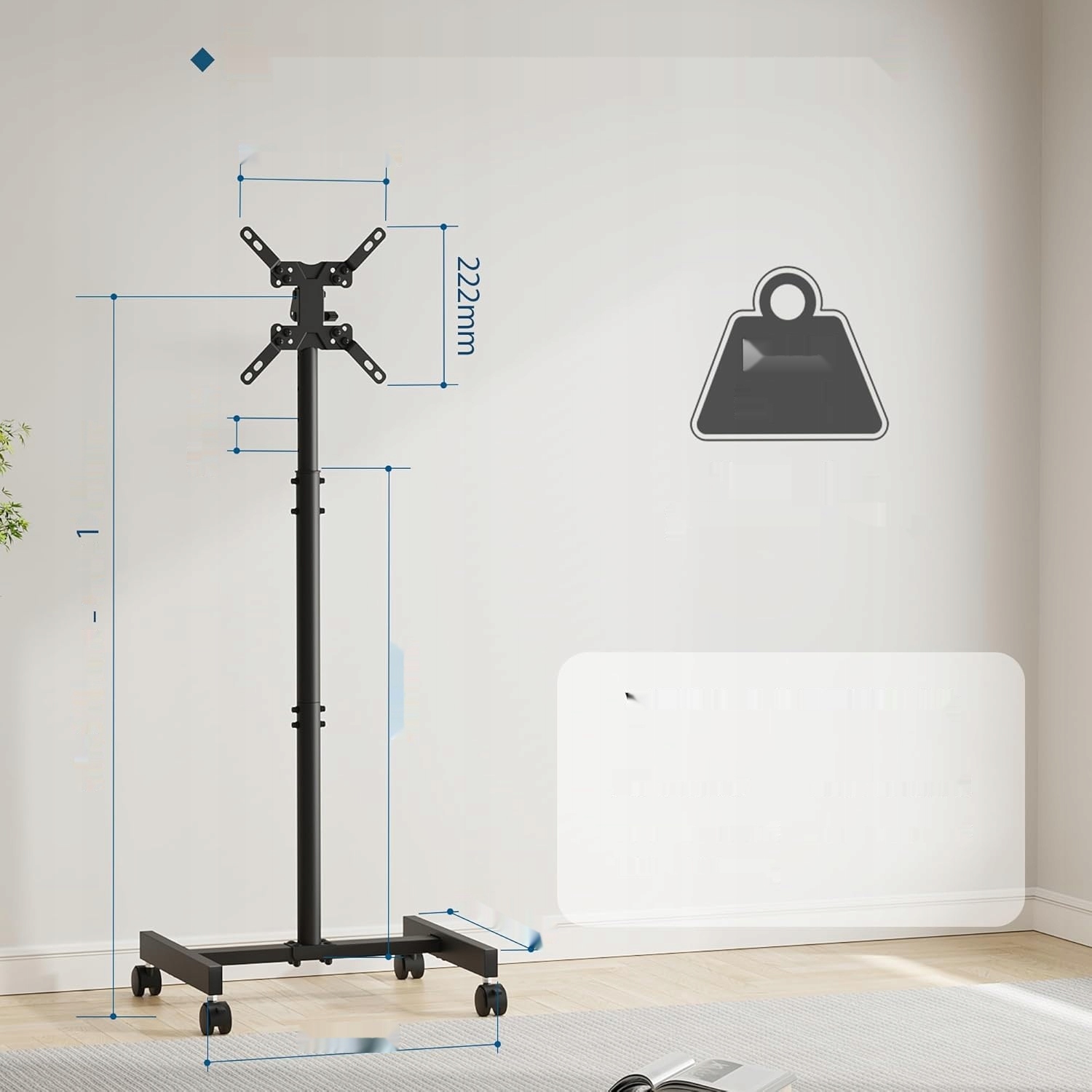 - Стабільність і мобільність: Оснащений чотирма тихими колесами, які обертаються на 360°, підставку може легко переміщати навіть одна людина. Колеса мають замок для безпеки, що робить його ідеальним рішенням для громадських місць, таких як готелі чи торгові центри.