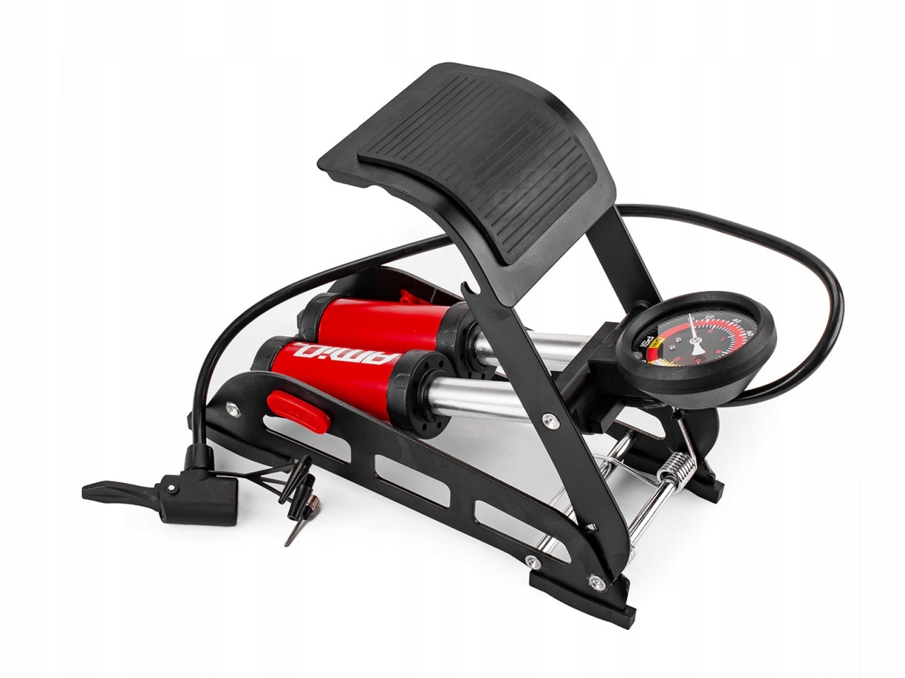 Завдяки довгому шлангу 750 мм і потужним подвійним циліндрам ножного насоса ви можете накачати шини, м’ячі та матраци миттєво.