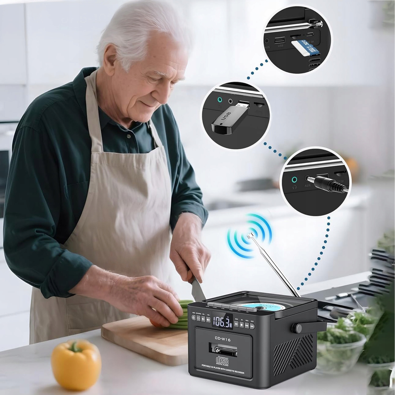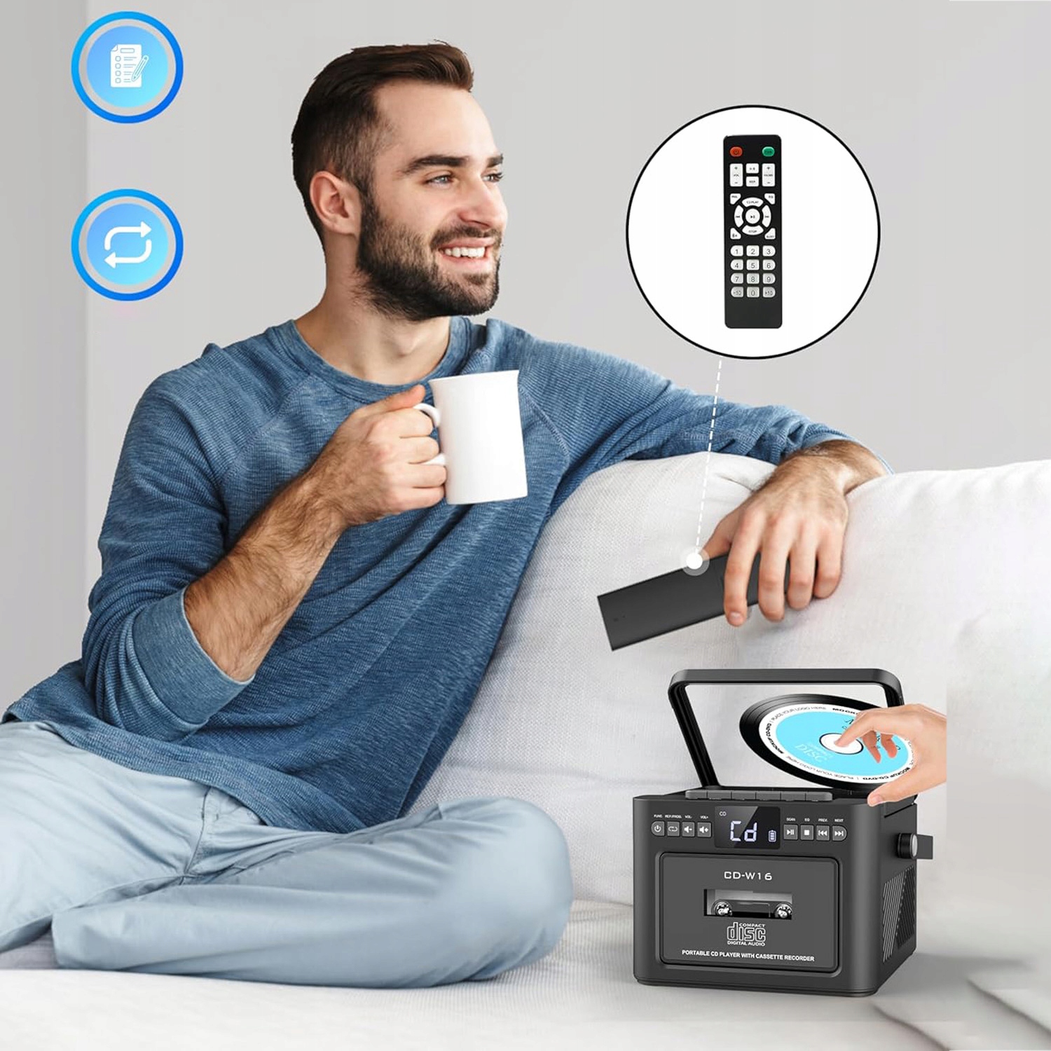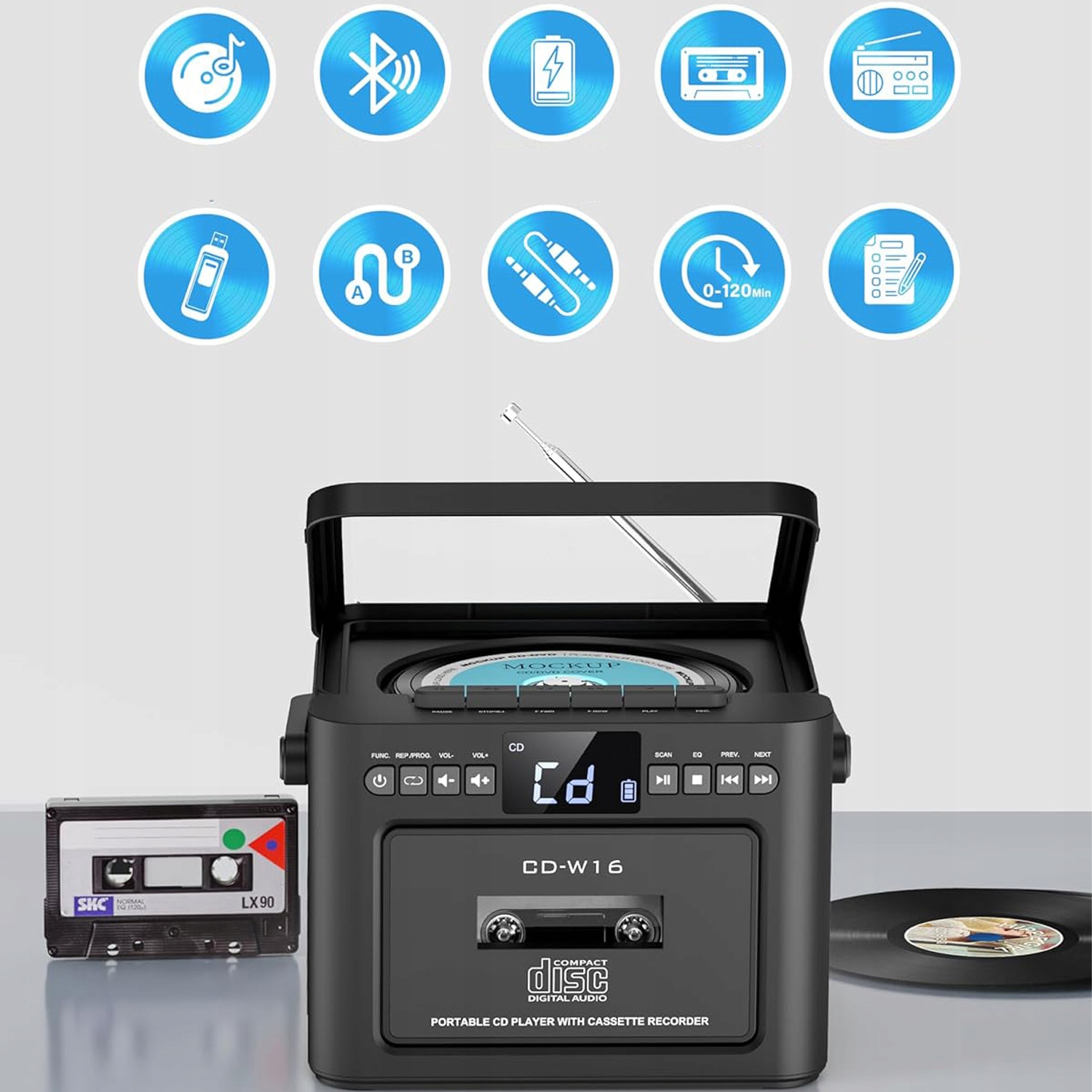 Цей CD-радіо пропонує кілька варіантів відтворення, зокрема CD, радіо, касету, Bluetooth 5.1, USB, AUX і відтворення на SD-карті. Касетний плеєр оснащений світлодіодним дисплеєм і пультом дистанційного керування для зручного керування. Він дозволяє легко перемикатися між піснями, регулювати гучність і вибирати різні режими відтворення. Завдяки цьому багатофункціональному пристрою ви можете насолоджуватися улюбленою музикою в різних режимах.