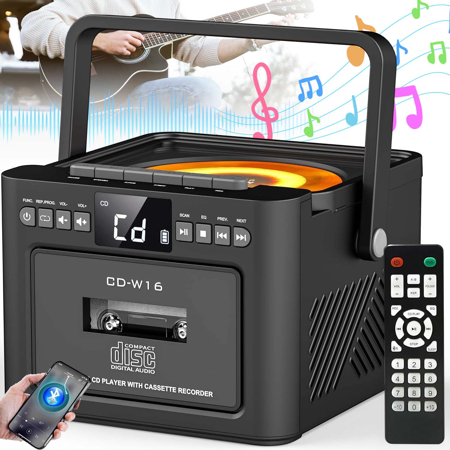 ✅✅ПОРТАТИВНИЙ ПРОГРАВАЛЬНИК КОМПАКТ-ДИСКІВ, КАСЕТНИЙ МАГНІТОФОН BOOMBOX З FM-РАДІО, BLUETOOTH 5.1, ВХІД AUX/USB/SD-КАРТКИ, АКУМУЛЯТОР 5000 МАГ, ПУЛЬТ ДИСТАНЦІЙНОГО КЕРУВАННЯ ТА СВІТЛОДІОД (ЧОРНИЙ)✅✅
