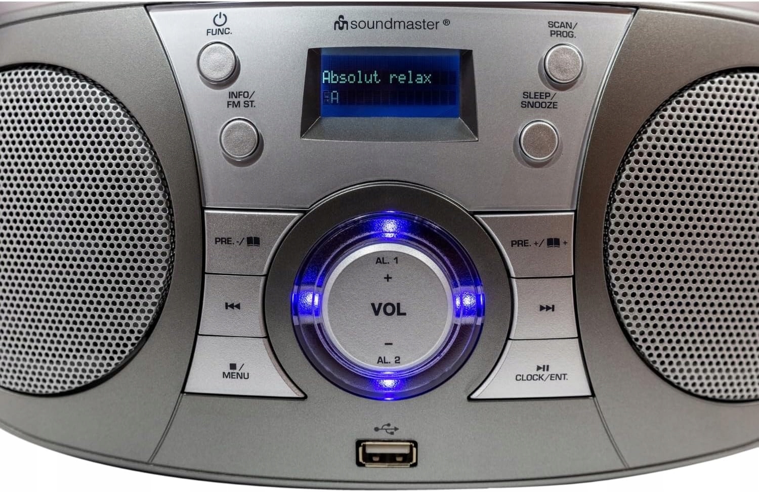 SoundMaster SCD1800TI -надзвичайно елегантний пристрій Hi-Fi. Обладнання виглядає надзвичайно елегантно та стильно. Поєднання сірого із срібними додатками на передній частині корпусу та кнопки управління, а також синя підсвічування, це ідеально вписується в будь -який простір та стиль.