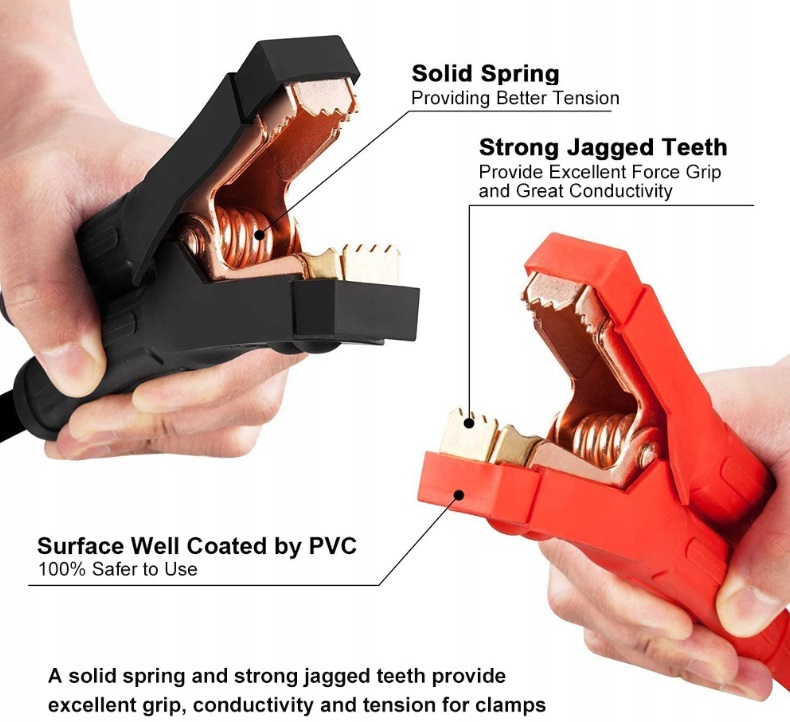 50 мм2 поперечний переріз забезпечує безпроблемний запуск будь-якого транспортного засобу, від легкового до автобуса, вантажівки чи сільськогосподарського трактора. Одна покупка на все життя. Крім того, наші кабелі оснащено дуже міцними затискачами типу «крокодил» (найбільші з доступних на ринку), які мають міцну пружину, завдяки якій кабель не може зісковзнути з клеми акумулятора.