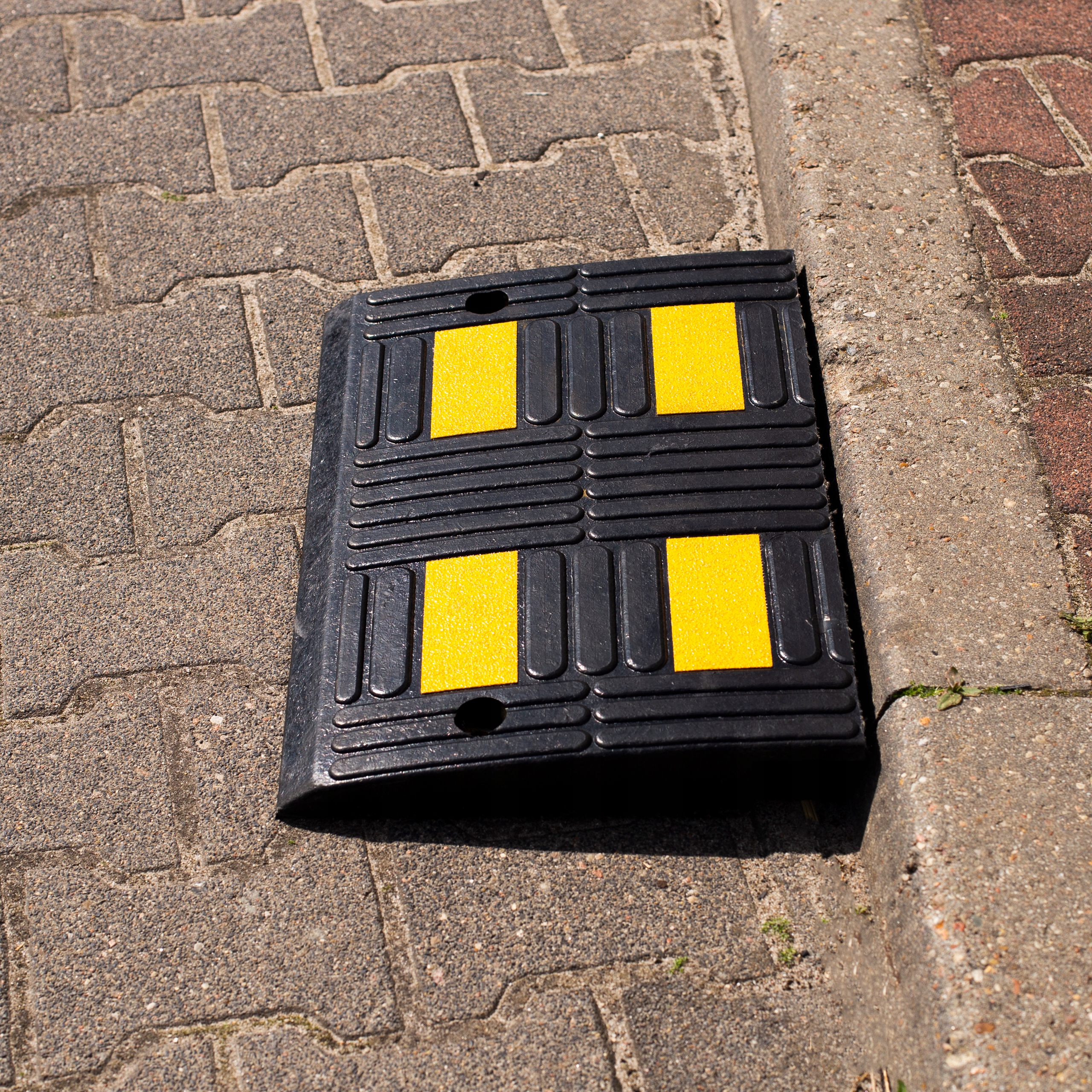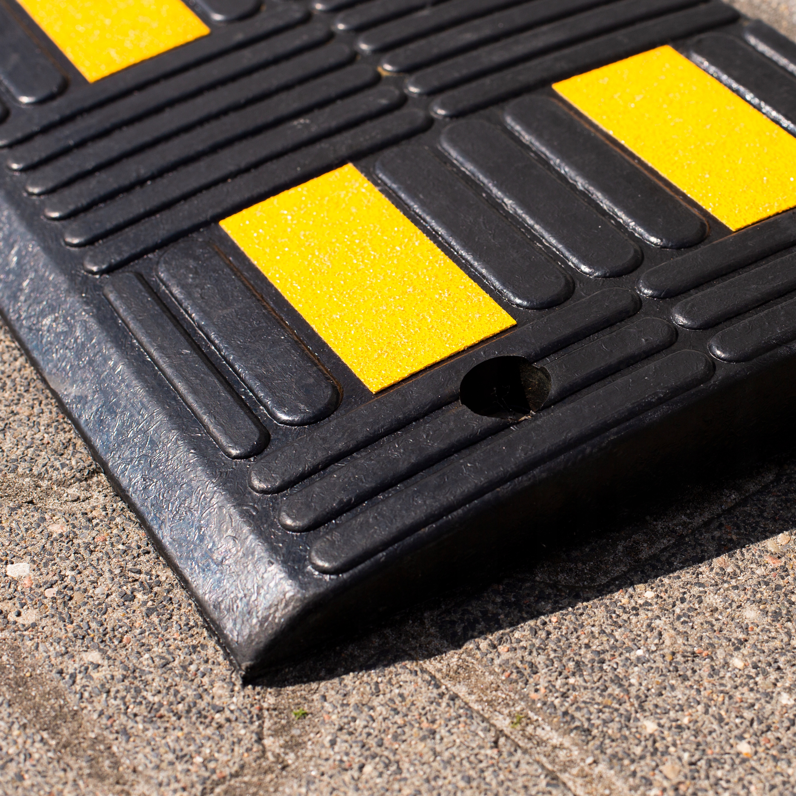 Рампа виготовлена з міцної гуми EPDM, армованої кордом, ідеально підходить для використання як бордюрний пандус. Його можна закріпити на поверхні за допомогою кріпильних елементів (розширювачів) або використовувати як тимчасовий елемент.