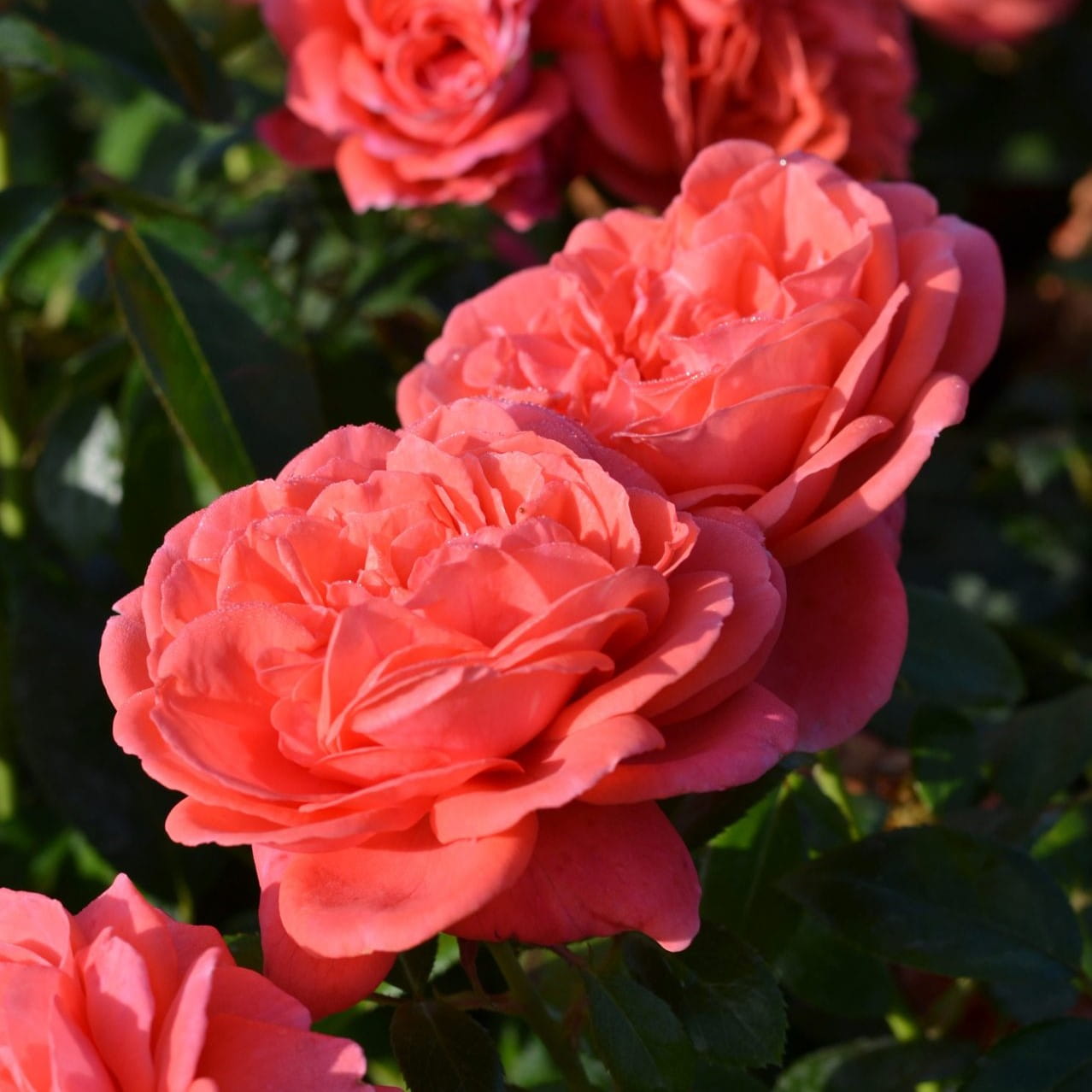 Його великі махрові квіти рожевого відтінку з лососевим відтінком помітні здалеку, вони поступово з’являються протягом літа та витончено несуть легкий квітковий аромат.