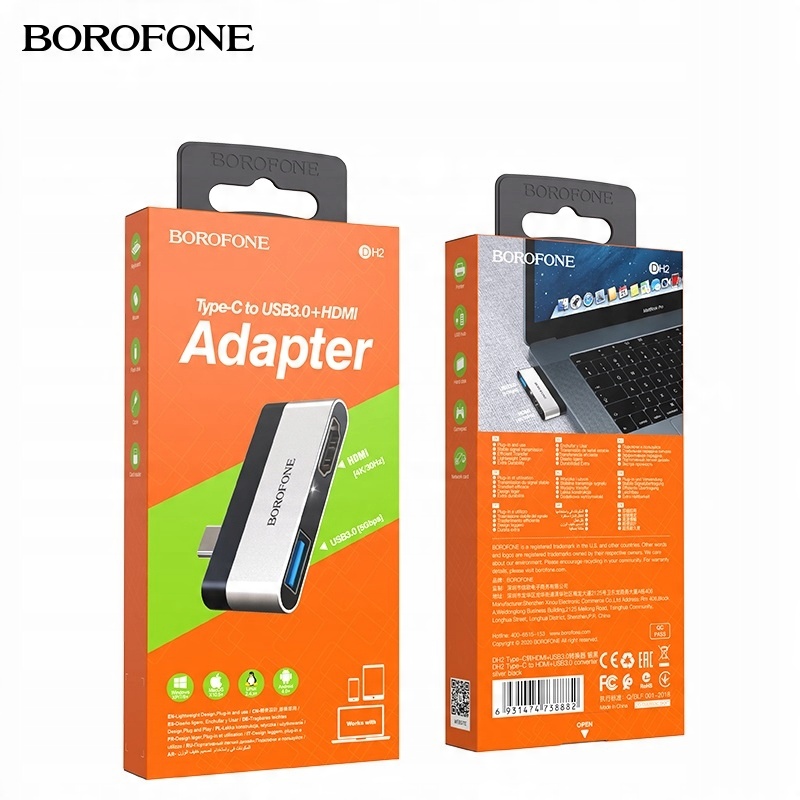 borofone dh2 -це адаптер / конвертер / адаптер з одним HDMI-з'єднувачем та другим USB-A версії 3.0, що сприяє підключенню до Laptop / useboin, що має тип USB-типу HY, та us0, що має тип USB HY-HYD, HY-HY HY0 та US0 розетки та розширення функціональності обладнання з додатковими портами.