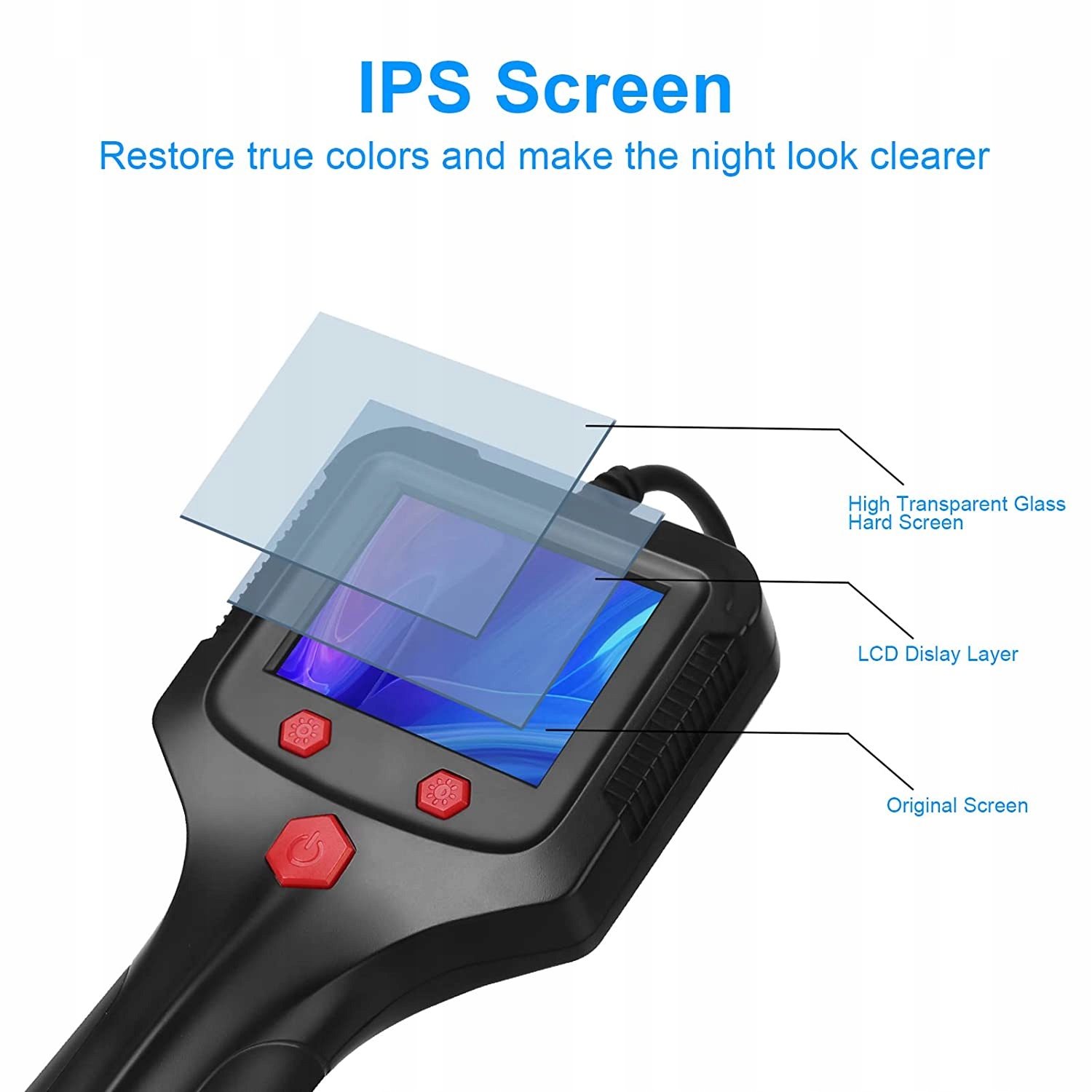 Легкий огляд. Ендоскоп оснащено водонепроникною лінзою IP67 і гнучким кабелем, що дозволяє легко перевіряти його у вузьких місцях. Для більш чіткого перегляду він також має 2 лампочки з регульованою яскравістю, що забезпечує чітке зображення в темряві. Бічна камера 8 мм Бічна камера 8 мм дозволяє перевірити циліндр або внутрішню стінку перед демонтажем або розбиванням стіни. Полегшення роботи Оснащений 24-дюймовим IPS РК-екраном і вбудованим акумулятором на 2600 мАг для зручності роботи. Широке застосування широко використовується в саморобній хімічній промисловості перевірки трубопроводів, обслуговування кондиціонування повітря тощо.