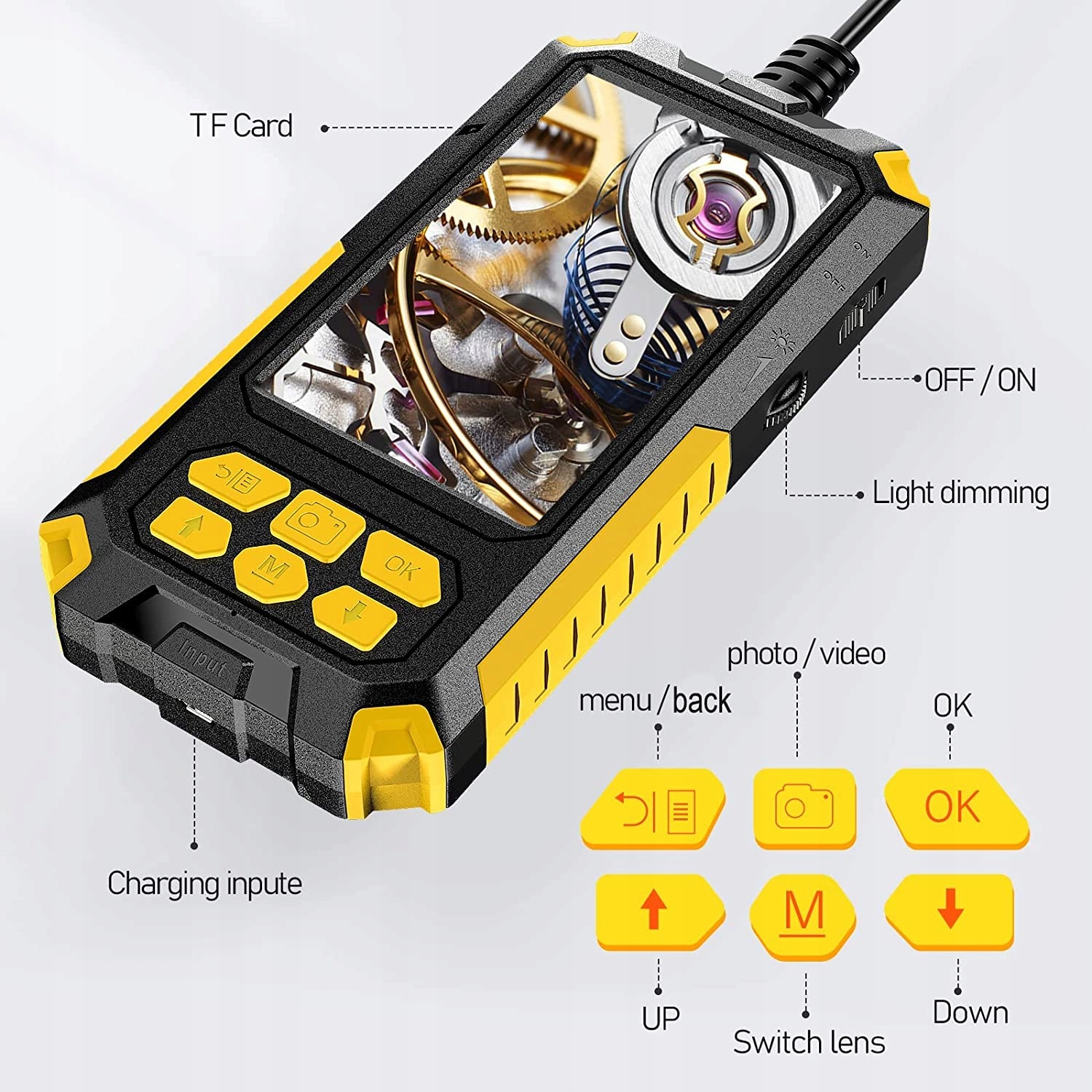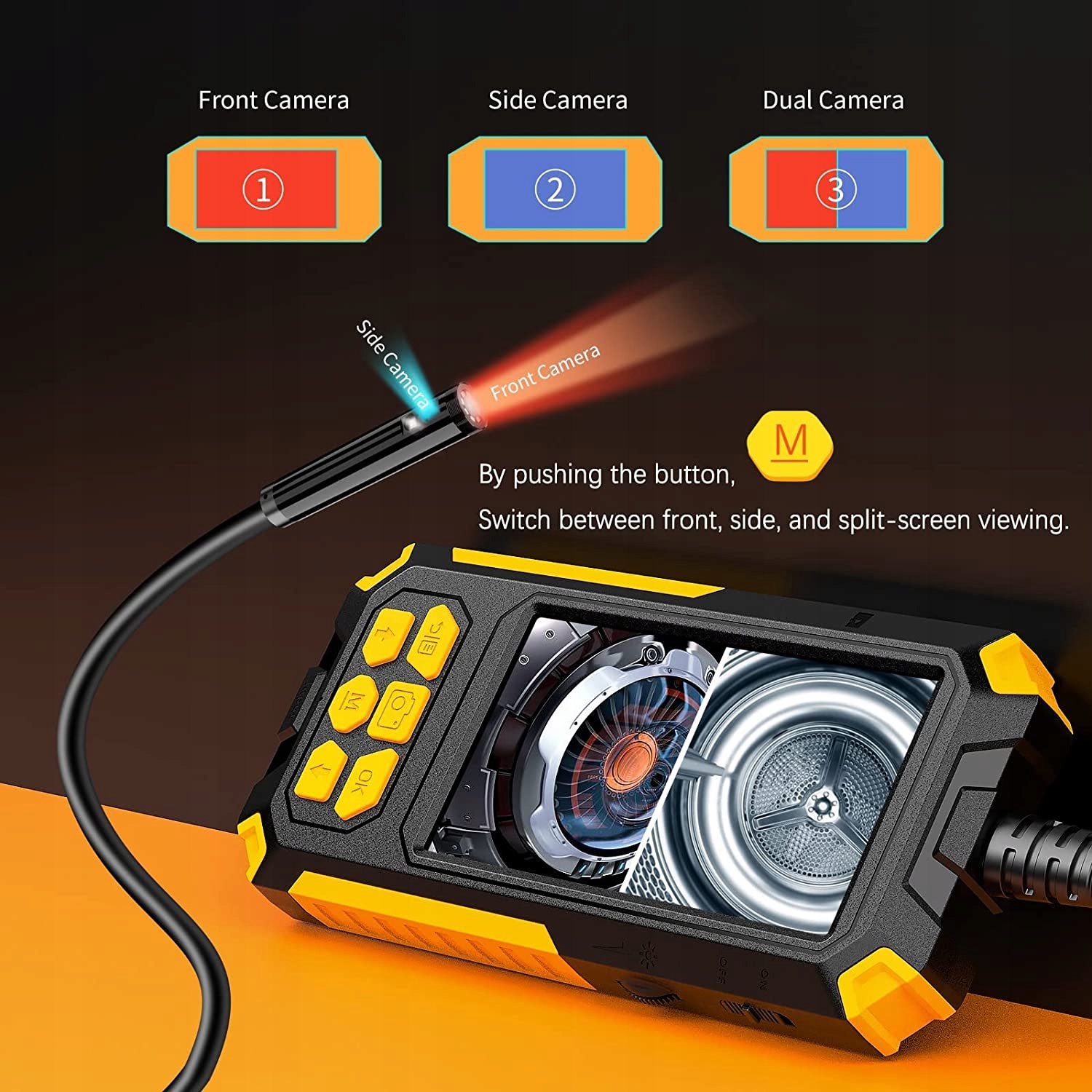 Бороскоп із подвійною камерою. Цей промисловий бороскоп із двома камерами, передньою та боковою камерами, тож ви можете бачити спереду та збоку у вузьких місцях. за допомогою однієї кнопки для перемикання 3 режимів перегляду Режим переднього виду Режим бічного огляду Передній і бічний вид, а саме оглядова камера з розділеним екраном робить процес огляду легшим і швидшим. HD IPS 45 Screen Ендоскопічна камера з покращеним екраном IPS 45 показує чітке зображення з контровим підсвічуванням із справжніми кольорами. Оглядова камера може записувати дійсно чіткі зображення 1080p і плавне відео. IPS-екран із широким горизонтальним кутом огляду приблизно 170° забезпечує комфортний перегляд з будь-якого положення. Камера ендоскопа HD 1080p Завдяки камері HD і вдосконаленому датчику ендоскопічна камера записує чіткі зображення з сильним контрастом, точними деталями та реалістичними текстурами. Ендоскопічна камера зі світлодіодним підсвічуванням, яка дозволяє перевіряти вузькі та темні простори та робити чіткі фотографії та відео. Напівжорсткий кабель і водонепроникна камера IP67. Напівжорсткий 79-міліметровий кабель камери може проходити через важкодоступні труби або щілини та тримати 1 метр прямо, не згинаючи. Вони можуть вільно формуватися для спеціальних цілей. Трубна камера Borescope дозволяє перевіряти внутрішню частину циліндрів, за внутрішніми стінками, вентиляційні отвори, труби та інші важкодоступні місця, щоб уникнути проблем з розбиранням. Батарея високої ємності Ця вбудована літієва батарея ендоскопа ємністю 2600 мАг може працювати в різних ситуаціях протягом 3-4 годин. Підтримка мовних налаштувань англійська німецька французька іспанська італійська польська голландська чеська португальська турецька китайська. Набір включає 1 x Industrial Borescop, 1 x TF-карту на 32 ГБ, 1 x кабель для заряджання, 1 x посібник користувача може бути недоступним польською мовою, 1 x набір аксесуарів для магнітів-гачків.