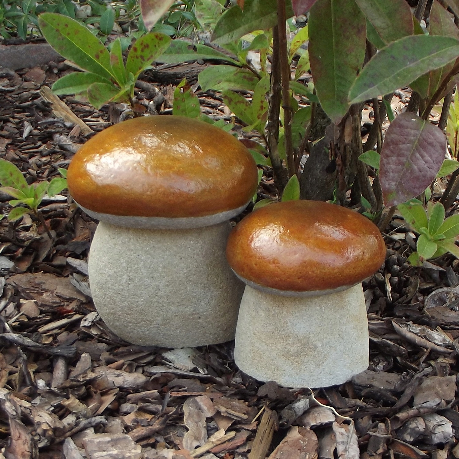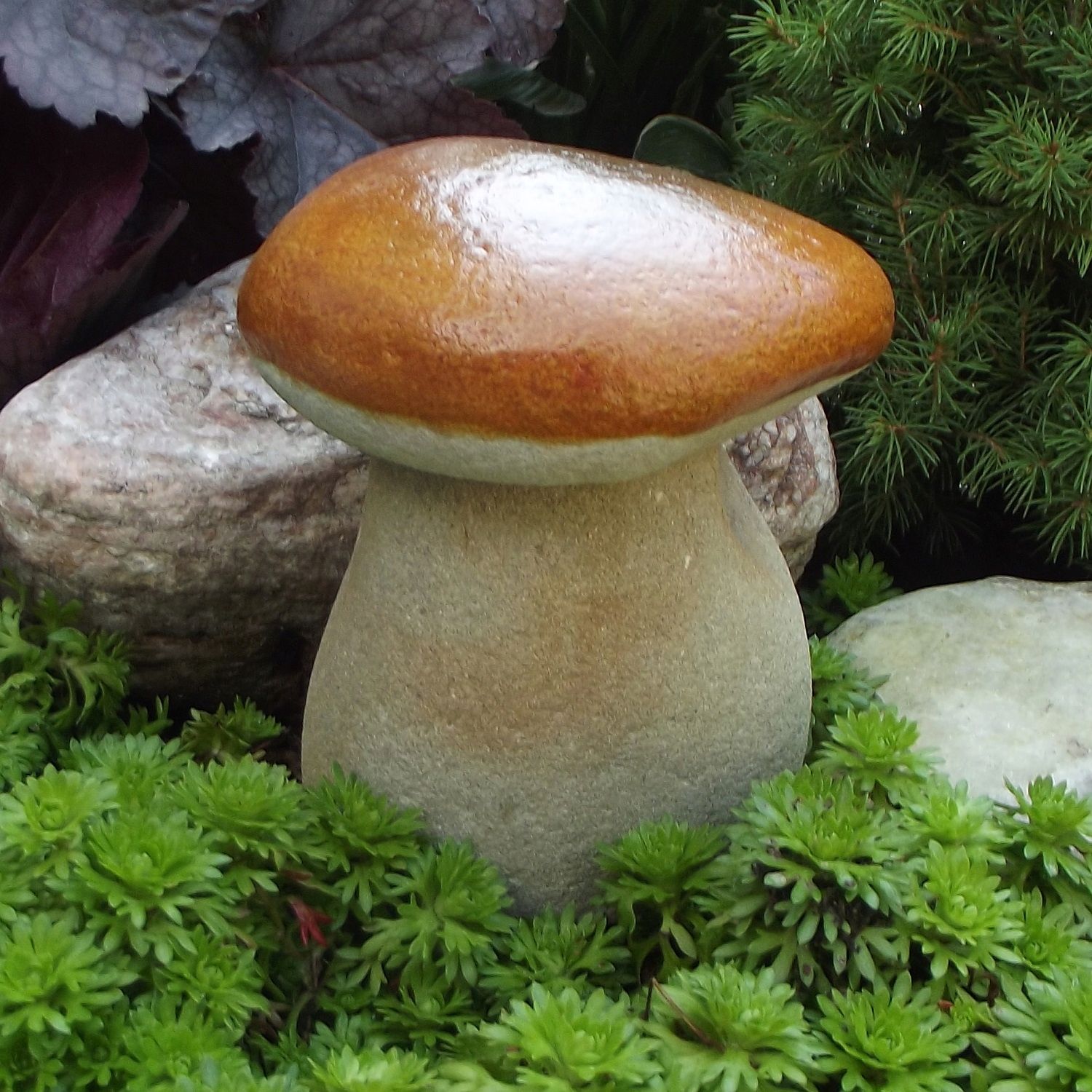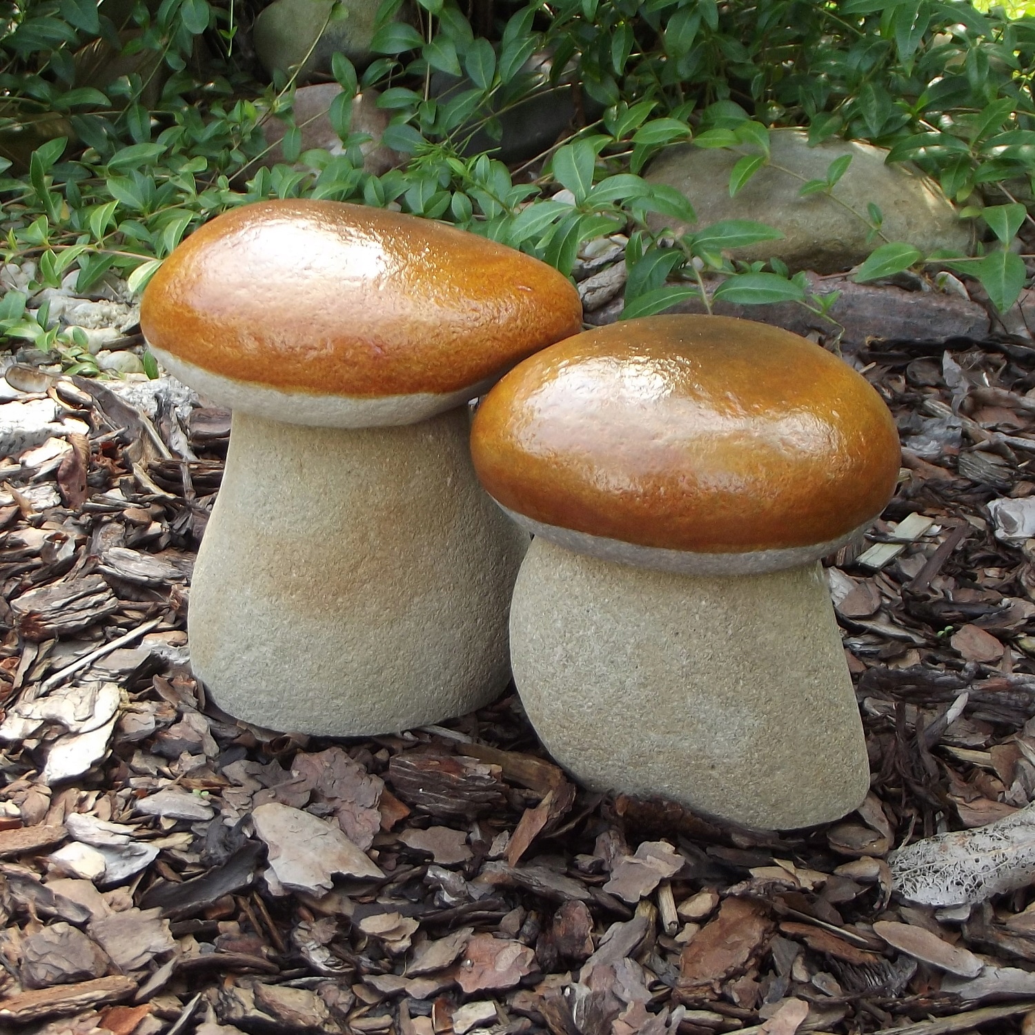 Великий гриб підберезник з натурального каменю. Фігурки міцні і стійкі до погодних умов, можуть зимувати в саду. Форма кісточок, сформована природою, робить кожен гриб унікальним. Розміщені в саду під туями, хвойними, на альпінарії або на корі, вони виглядають як справжні. Маса гриба від 1 кг до 3 кг, висота від 15 см до 18 см. На інших аукціонах інші кольори та багато оригінальних фігур.