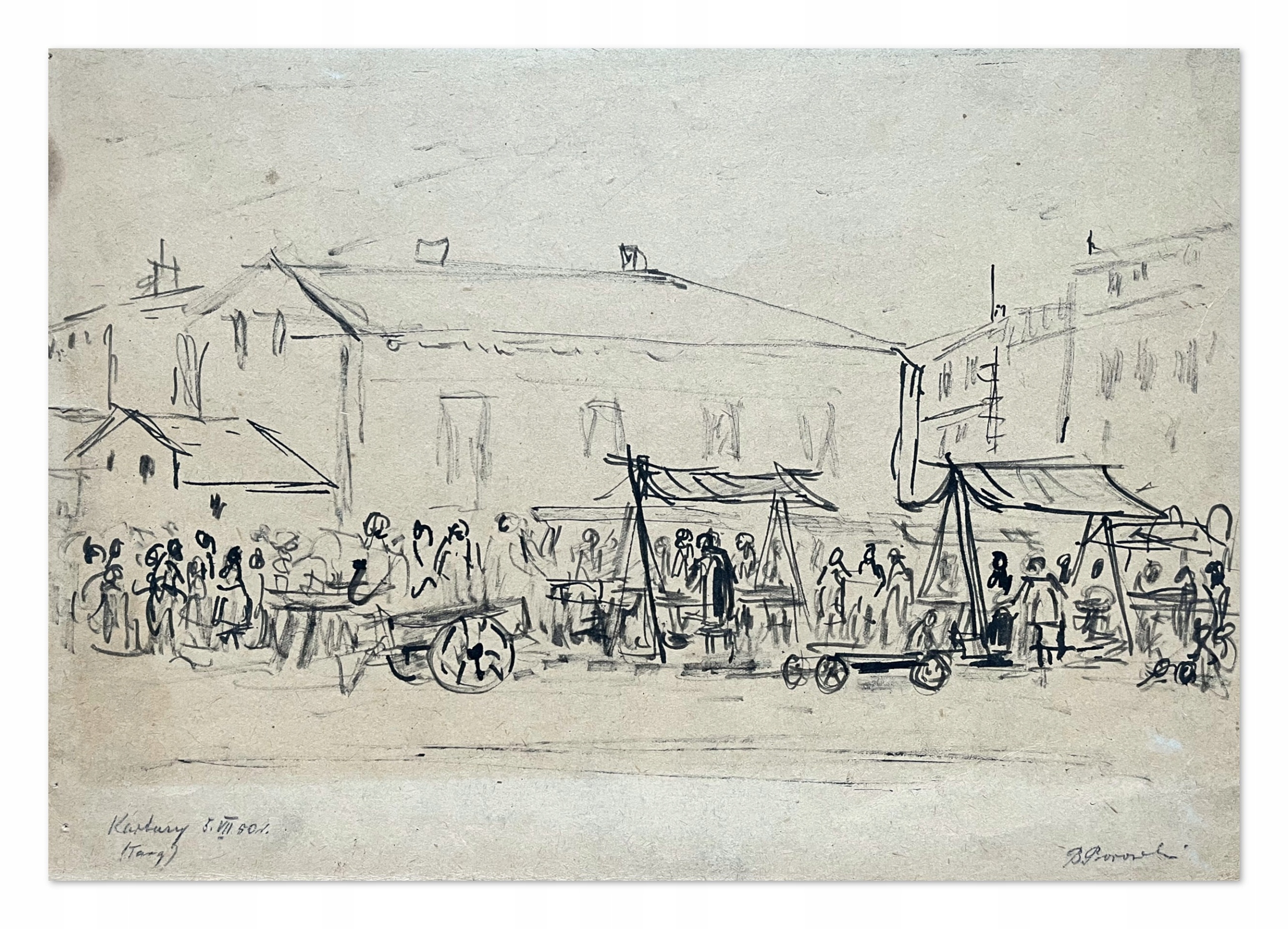 Borowski Bohdan Kartuzy Jarmark rysunek tuszem sygnowany 1950 r. certyfikat