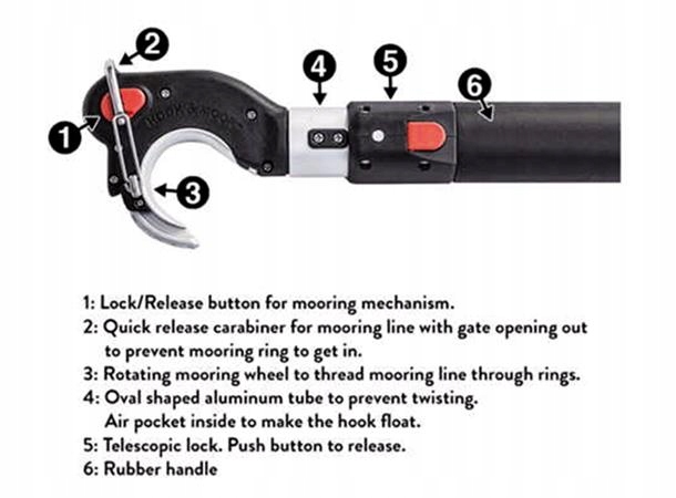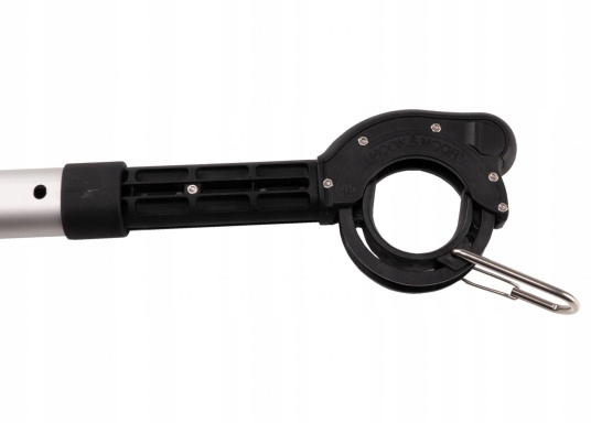 Автоматичний човновий гак Hook & Moor допомагає протягнути швартовну мотузку через швартовне вушко або затиск мосту одним потягуванням або поштовхом. Це забезпечує безпечне та комфортне швартування до буя, усуваючи необхідність нахилятися за край палуби. Hook & Moor, коли механізм заблокований, можна використовувати як стандартний гачок. Для його виготовлення використовувалися матеріали найвищої якості, такі як скловолокно, алюміній і нержавіюча сталь. Телескопічна конструкція полегшує зберігання, а гумова ручка забезпечує стабільність захоплення. За бажанням ви можете придбати оригінальний тримач Hook & Moor для кріплення на рейку або стіну. Доступні три варіанти довжини: 180, 250 і 320 см.
