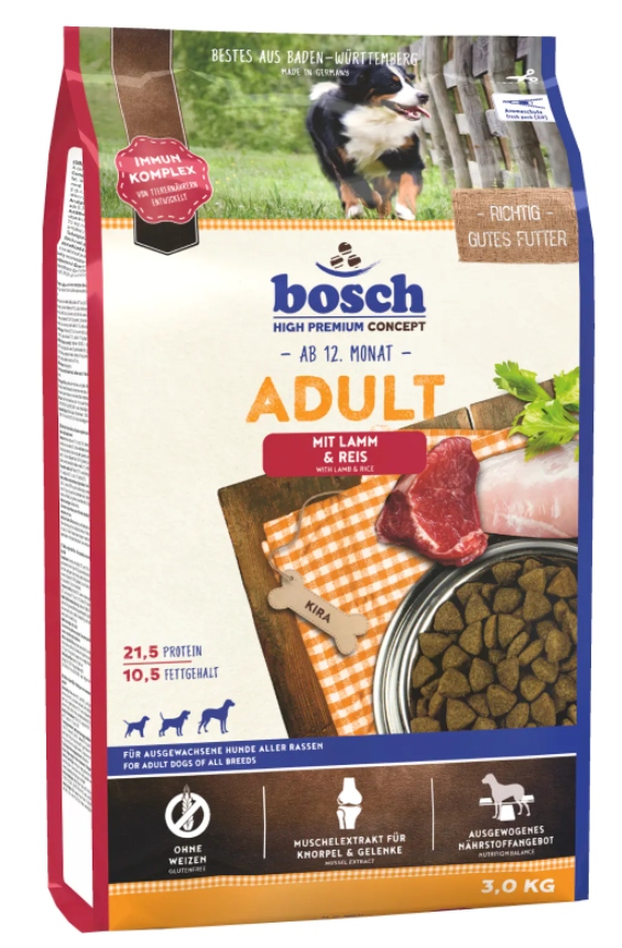 Bosch Adult - це збалансований корм для кожної дорослої собаки з середньою активністю, що містить унікальну комбінацію ягняти і легкозасвоюване м'ясо рис. Цей корм має збалансоване співвідношення енергетичних субстратів і білків.