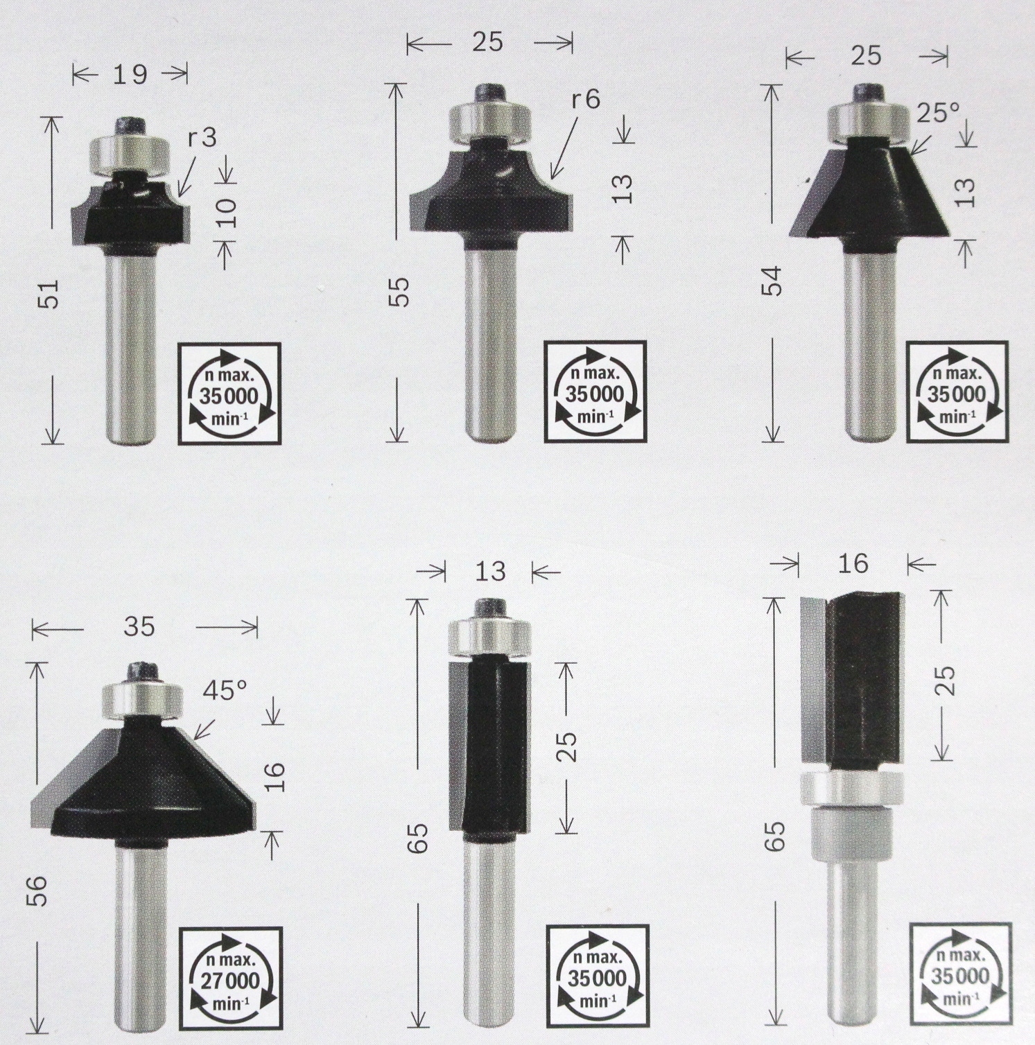 - В комплект входять фрези діаметрами: 13, 16, 19, 25, 25, 35 мм.