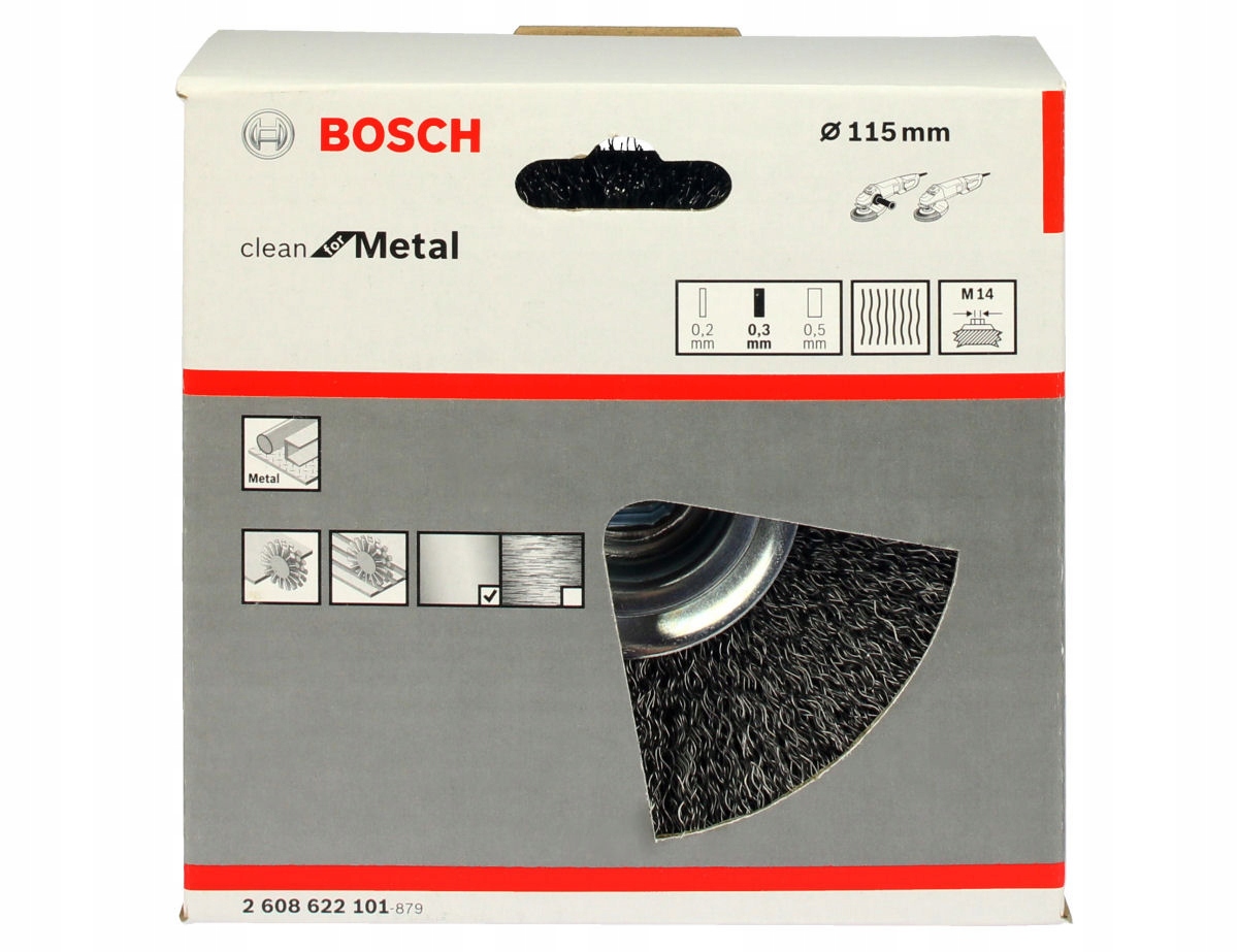 Конічна щітка з гофрованого дроту Clean for Metalз різьбленням M14 забезпечує точність очищення невеликих сталевих поверхонь в пазах або кромках за допомогою кутових шліфувальних машин і прямих шліфувальних машин GGS 6 і GGS 8 від BOSCH