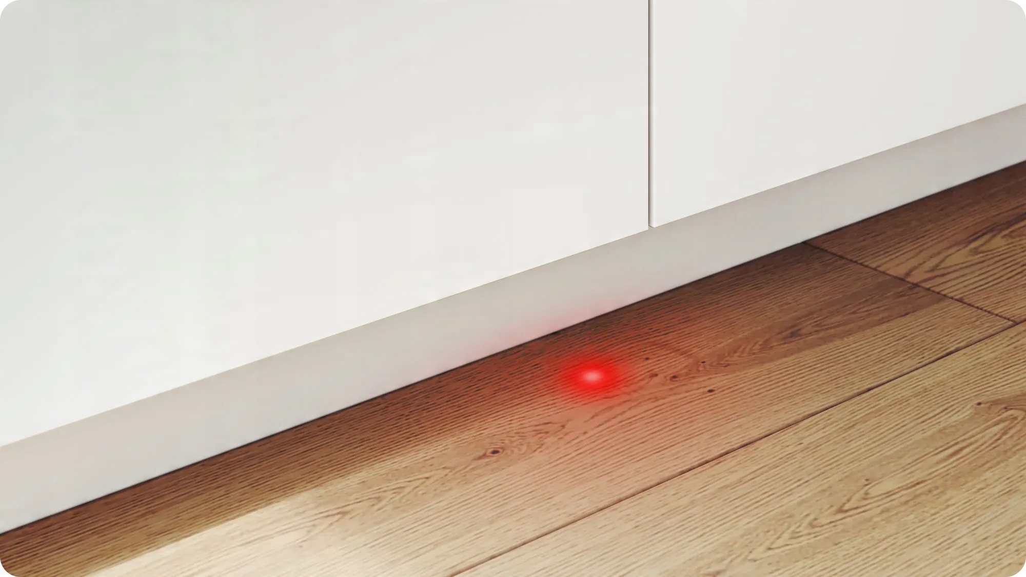 Активність посудомийної машини позначається червоним світлом промінь, що випромінюється на підлогу під час роботи пристрою. Після завершення програми світло автоматично вимикається. Завдяки цьому вам не потрібно відкривати дверцята пристрою, щоб перевірити, чи закінчила роботу посудомийна машина.