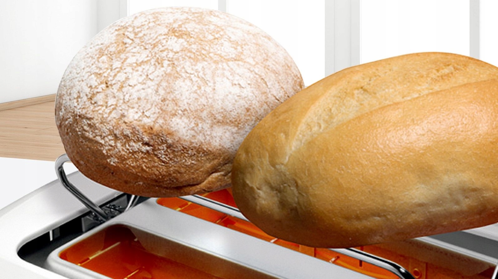 Тостер з унікальним простим керуванням. Захоплюючий дизайн, поверхня з матово-глянцевими відблисками оживляє кухню. Функції розморожування та розігріву: завдяки цим функціям ви можете розморозити хліб, вийнятий із морозильної камери, і знову зробити його свіжим і хрустким. Вбудована решітка для тостів. Високий підйом: полегшує вийняття навіть маленьких скибочок хліба. Автоматичне вимкнення: вимикає тостер, якщо хліб заблокований у камері для тостування. Точне підсмажування завдяки автоматичному центруванню тостів